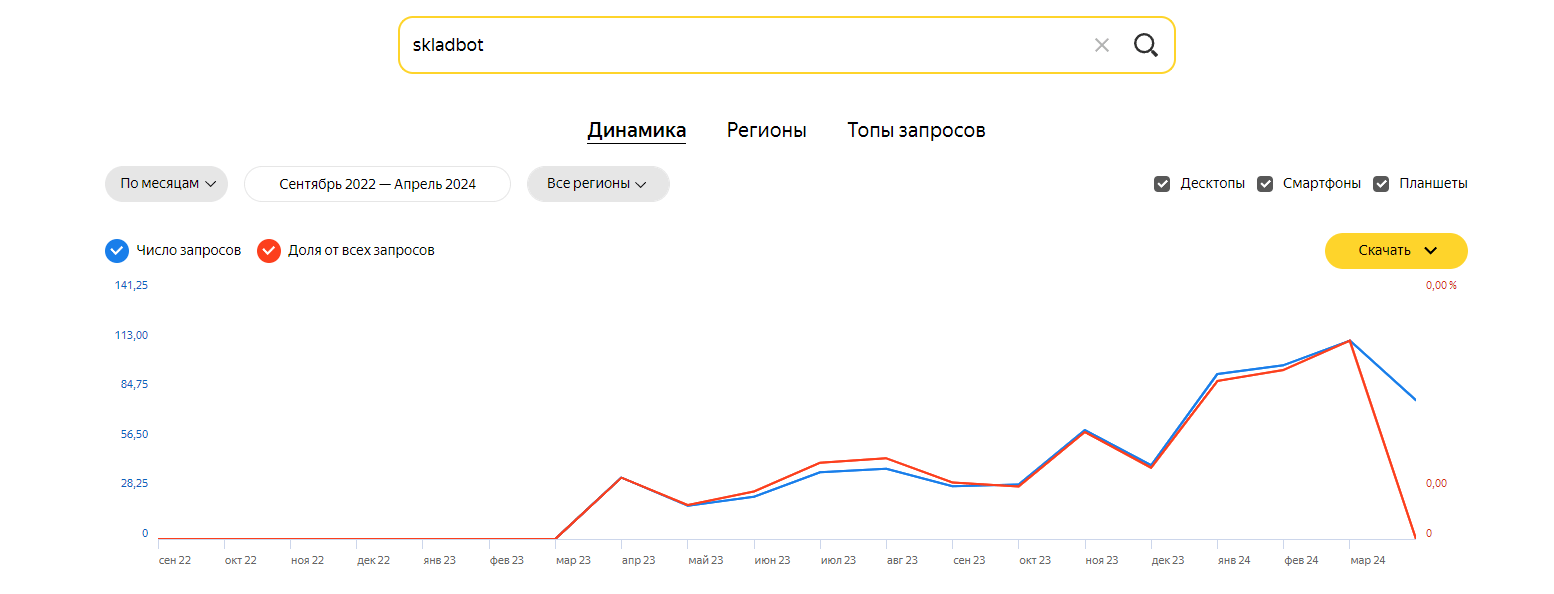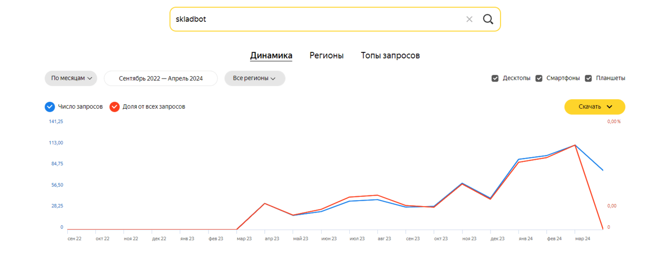 2. За полтора года сотрудничества мы подготовили для Skladbot более 40 статей. И трафик одного только блогового раздела на сайте за это время вырос с нуля до 1870 пользователей в месяц.