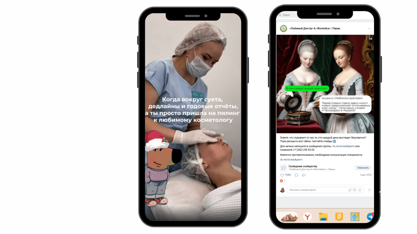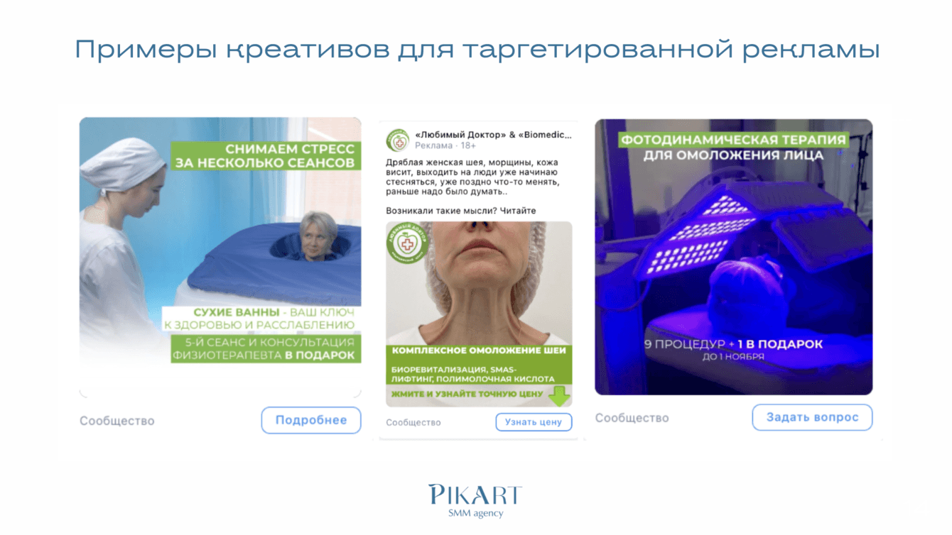 В первые месяцы работы мы особенно активно продвигали косметологию и физиотерапию (около 40-50% всего контента было посвящено им). В дальнейшем процентное соотношение могло меняться, исходя из новых целей (например, к осени нужно было активнее продвигать чекапы у педиатра, кардиолога и других врачей).