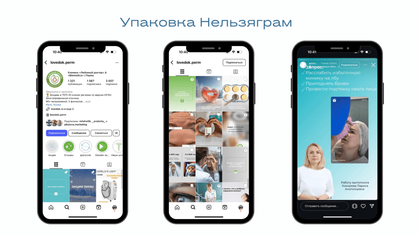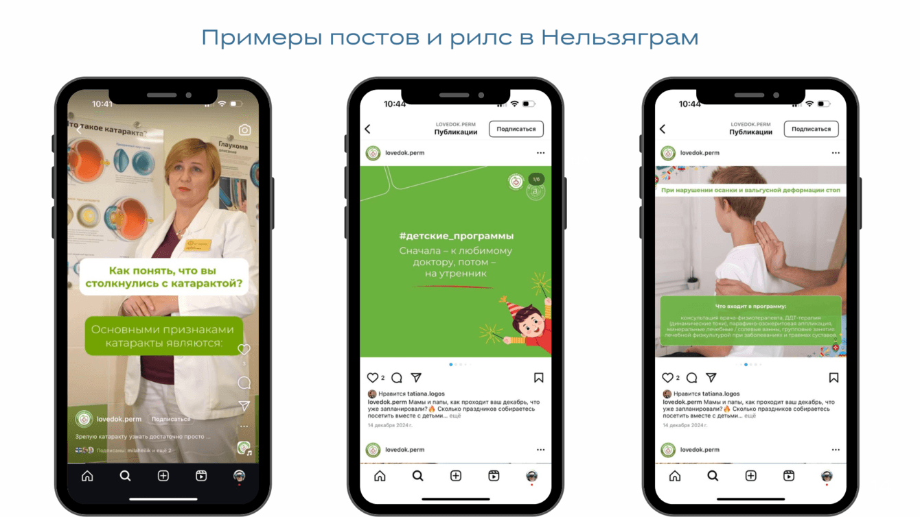 ✔ клиника перестала быть просто "ещё одной медицинской сетью" – теперь она имеет целых три хорошо упакованные соцсети, которые привлекают пациентов и создают положительное впечатление уже при первом касании: Нельзяграм, ВК, Телеграм.