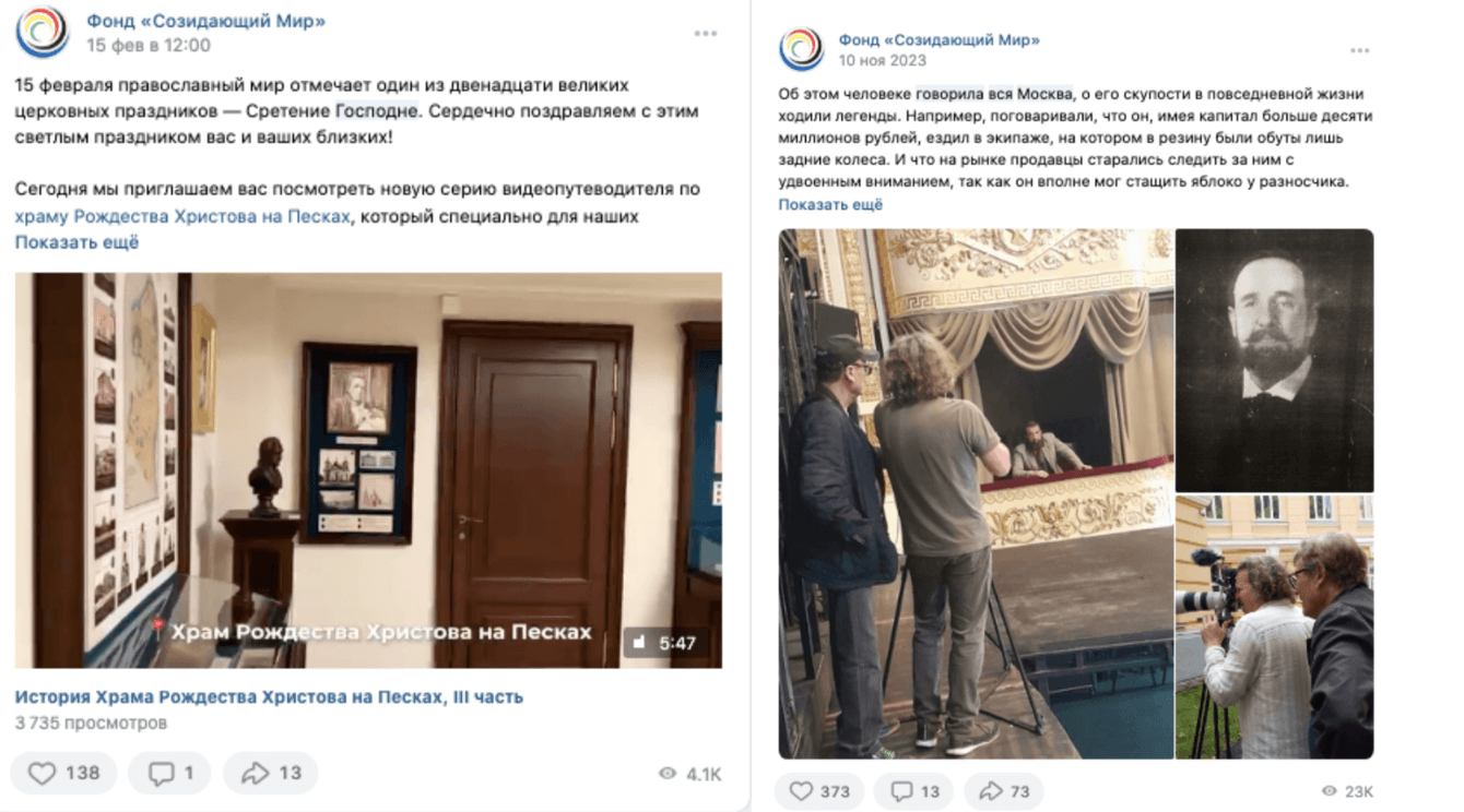 Нашей задачей было раскрыть ценность проекта и за счет этого увеличить количество сторонников. Деятельность «Созидающего мира» связана одновременно с интеллектуальной, культурной и творческой сферамии это важно соединить и преподнести аудитории в формате постов в соцсетях. Проект действительно сложный. Он включает в себя разные, при этом одинаково важные части. Каждая из них требует полного погружения для создания качественного контента. Мы ищем, анализируем и перерабатываем большой объем информации. Приходится погружаться в исторический контекст, технологии строительства, тонкости живописи и книгоиздательства. Весть контент для проекта создается нашей командой.