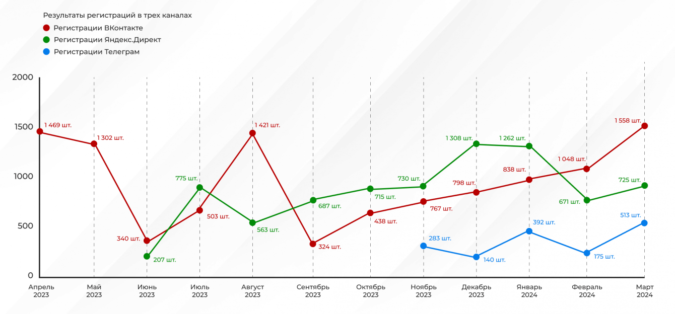 Результат за год: 21 000 регистраций по 165 рублей по трем каналам трафика
