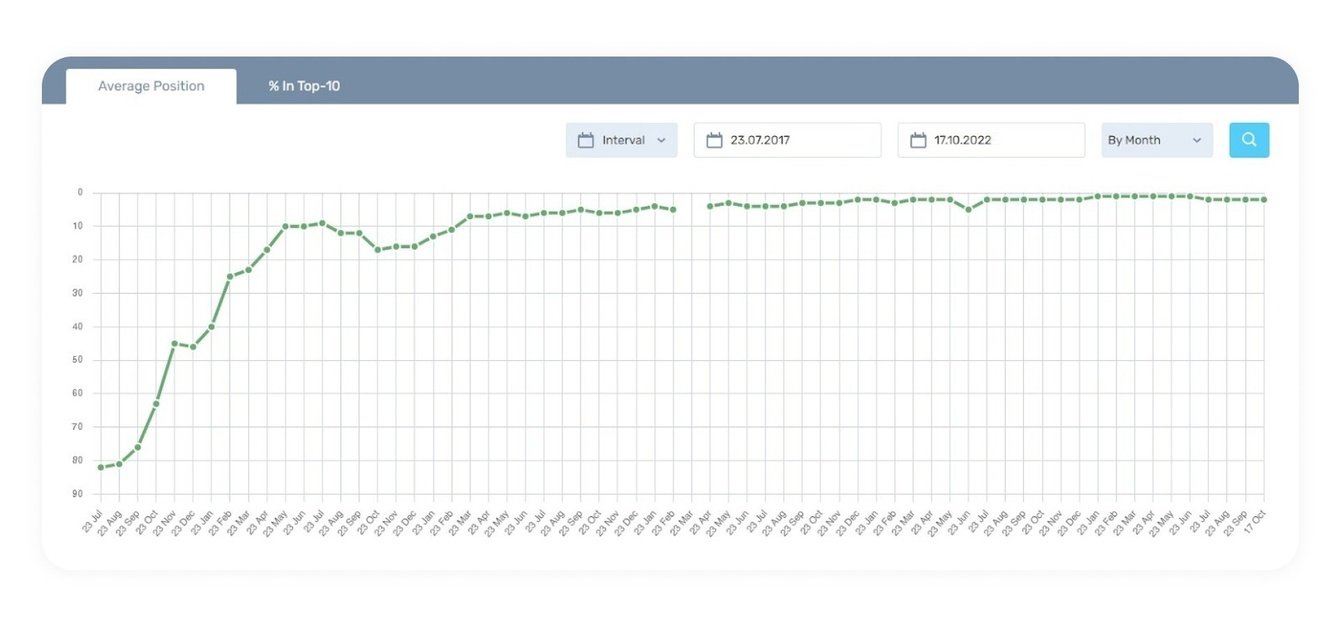 Результат работы с SEO — за 5 лет работы над продвижением около 600 запросов (самых конкурентных) вот так рос график средней позиции видимости сайта по этим 600 запросам:
