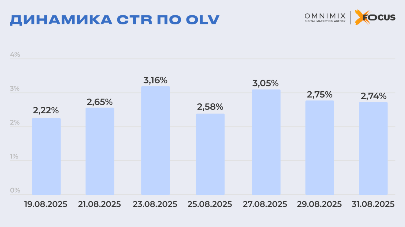 В OLV-направлении стартовые показатели зафиксировали критическое снижение CTR до 0,4%. Система AI-оптимизации платформы XFocus.io автоматически провела реконфигурацию с пересмотром источников трафика и интенсификацией KPI-ориентированной оптимизации. CTR стремительно восстановился до планового уровня (1%) и значительно превысил его.