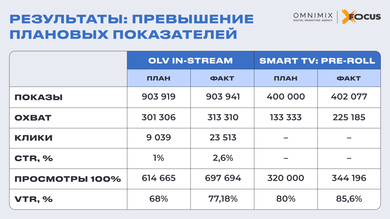 Все запланированные медийные метрики были достигнуты и превышены. OLV-сегмент продемонстрировал двукратное перевыполнение по кликам. Показатель VTR 77,18% существенно превосходит среднерыночные стандарты для 28-секундных роликов и подтверждает глубокую заинтересованность аудитории.