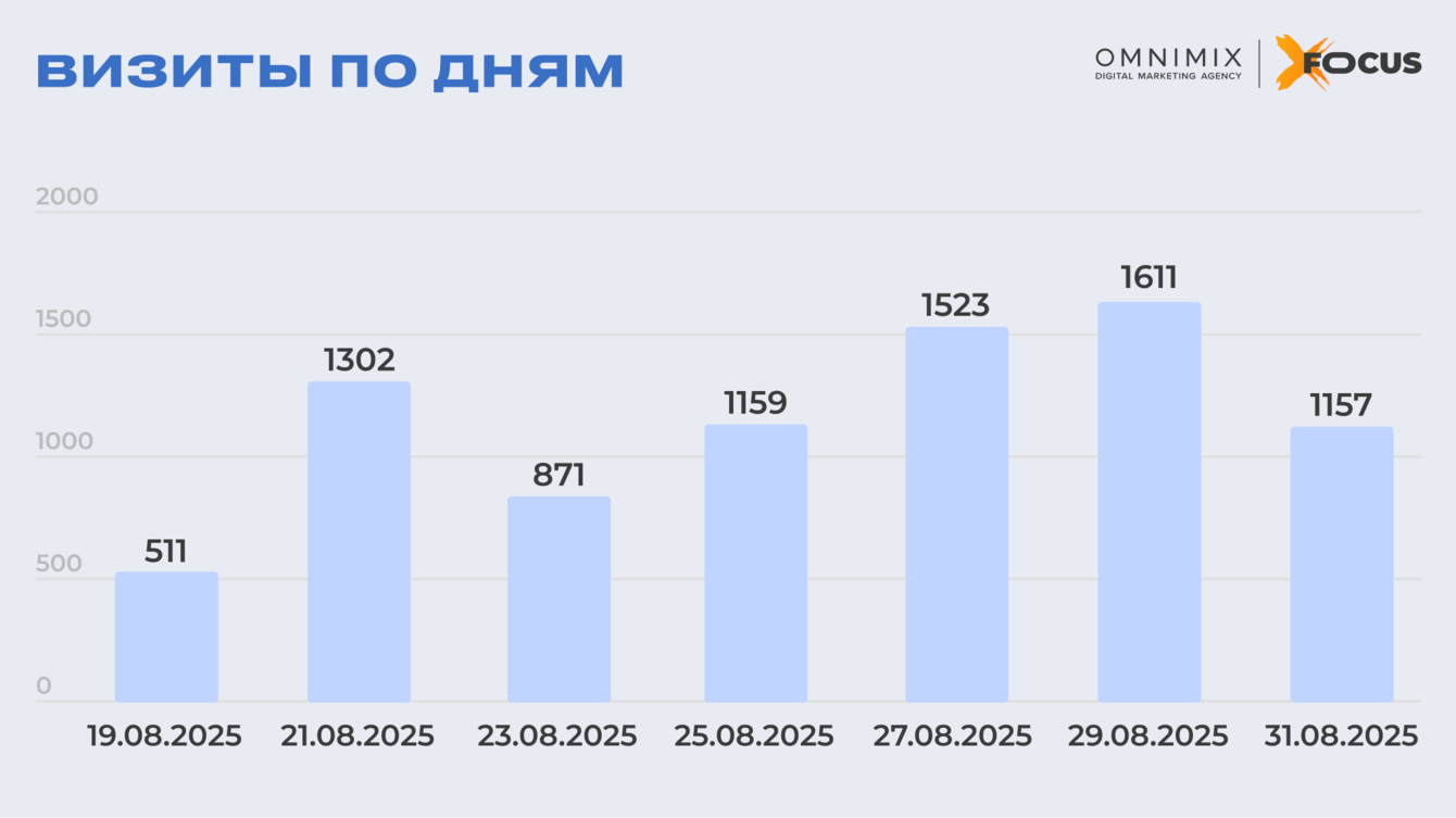 Динамика активности. Начальный период демонстрировал поступательный рост до значительного увеличения 21 августа. Фаза 22-26 августа характеризовалась стабильным уровнем визитов с незначительными вариациями. 26 августа зафиксирован временный спад, обусловленный техническими факторами. Начиная с 27 августа наблюдалась устойчивая восходящая тенденция с достижением абсолютного пика 30 августа. Данный паттерн стал результатом накопительного эффекта охвата и успешных оптимизационных мероприятий в средней фазе кампании.