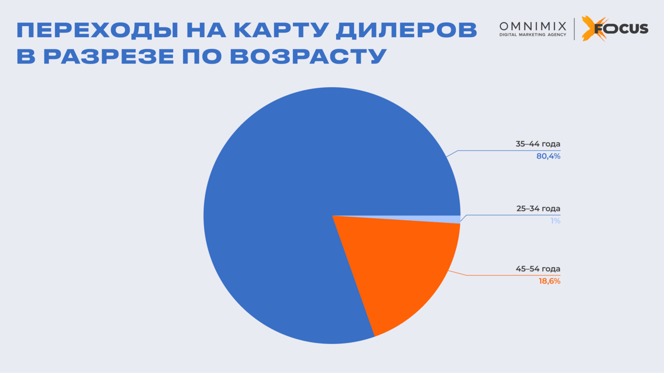 Возрастная аналитика. Подавляющее большинство переходов в дилерскую карту обеспечила аудитория 35-44 лет (80,4%) — приоритетный сегмент клиента. Вторичный таргетинговый сегмент 45-54 лет продемонстрировал меньшую активность (18,6%).