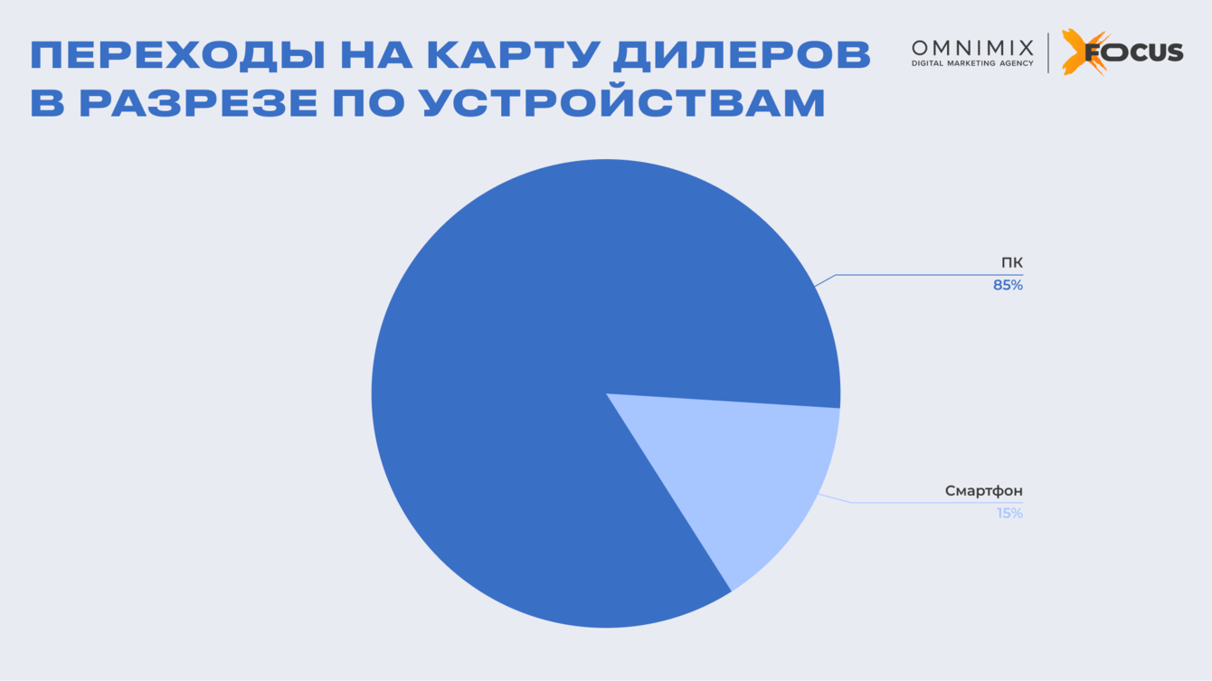 Устройства доступа. Преобладающий объем переходов в дилерскую карту реализован через персональные компьютеры — 85%, мобильные платформы обеспечили 15% переходов.