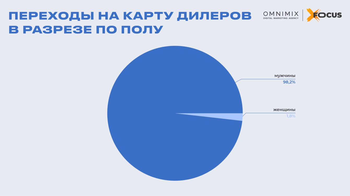 Демографическая точность. Переходы в дилерскую карту практически исключительно осуществлялись мужской аудиторией (98,2%), что неоспоримо подтверждает корректность таргетинговых настроек платформы и точное попадание в целевые сегменты.