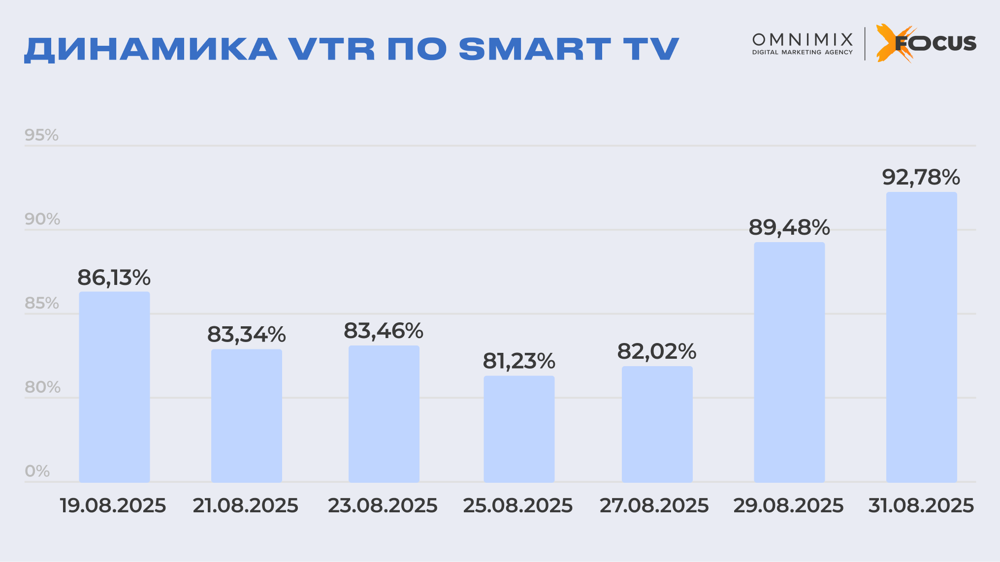 В Smart TV сегменте демонстрация реализовывалась с равномерным распределением показов. Несмотря на технические сложности 26.08, система платформы обеспечила оперативную стабилизацию. К завершающему этапу частота контактов увеличилась до 2,2-2,27, при поддержании исключительно высокого уровня досмотров (до 92,78% в финальные дни). Данные показатели свидетельствуют о глубоком вовлечении аудитории в рекламный контент без пропусков демонстрации.