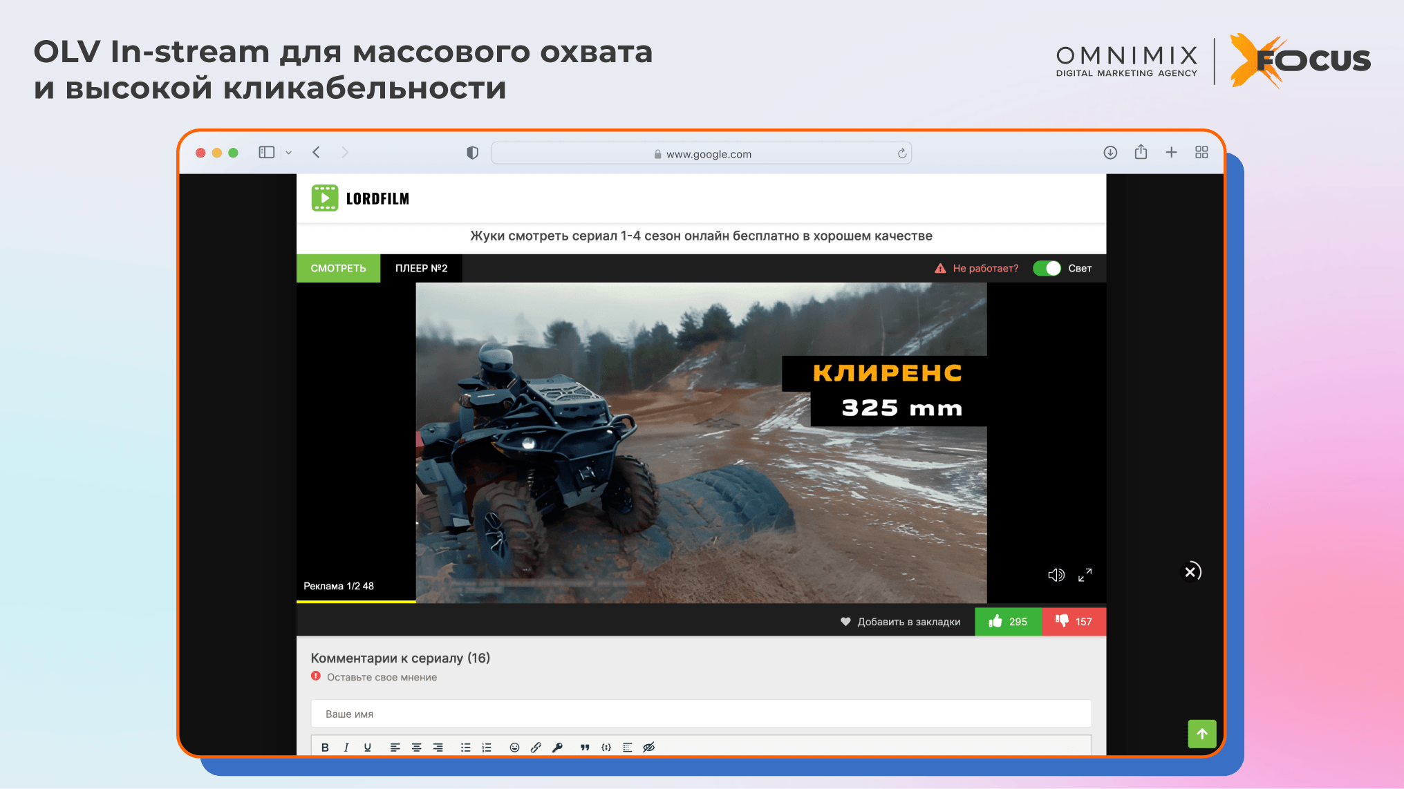 OLV In-stream для максимизации массового охвата с высокими показателями кликабельности.