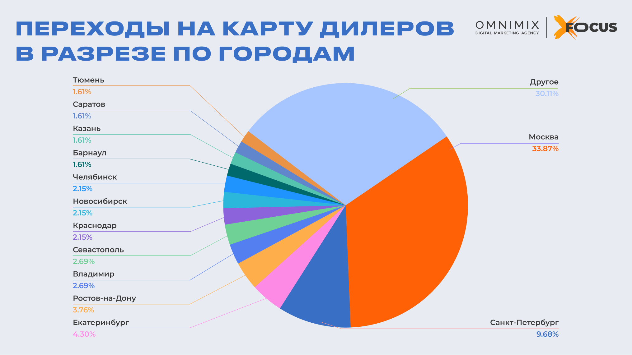 Географическое распределение лидов. Доминирующую долю трафика в дилерскую карту обеспечили Москва (31,8%) и Санкт-Петербург (9,1%). Существенный вклад внесли Екатеринбург (4%) и Ростов-на-Дону (3,5%). Остальные населенные пункты обеспечили от 0,5% до 2,5% каждый, сформировав обширное общероссийское покрытие.