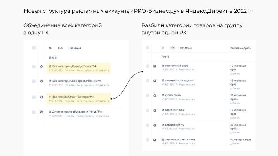 – Объединили все категории товаров в одну рекламную кампанию с разбивкой на группы. Все запросы с упоминанием брендов объединили в отдельную рекламную кампанию.