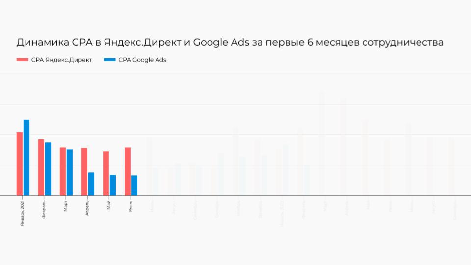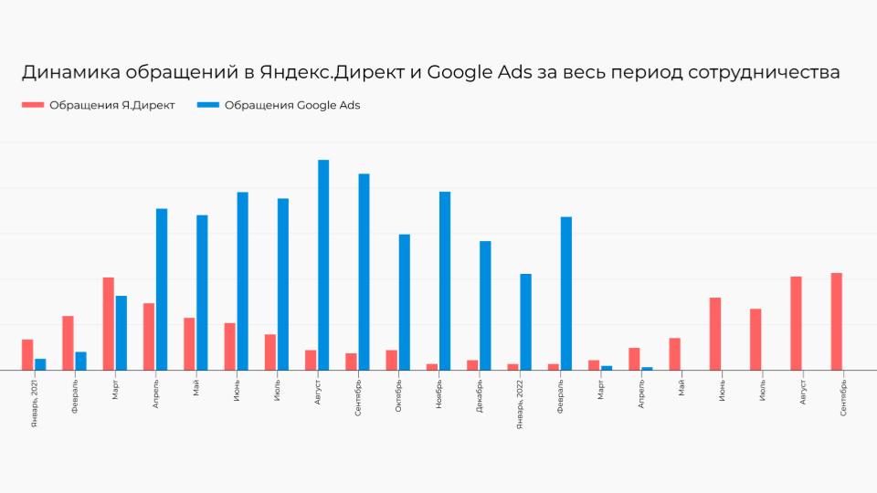 К началу весны 2021 года количество обращений из Google Ads достигло 90%. Мы успешно выполняли KPI, который был привязан к объёму лидов по согласованной с клиентом, доступной цене. Но в начале марта 2022 года, через неделю после начала специальной военной операции на Украине, Google Ads прекратил работу в России. Из общего количества обращений у нас остались всего 10%, приходивших от Яндекса, с CPA, которая в 3 раза превышала показатели Ads.