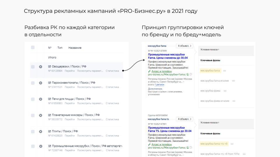 Мы начали сотрудничать с «PRO-Бизнес.ру» в конце 2020 года — продвигали продукцию интернет-магазина через Яндекс и Google Ads, делая упор на товарных рекламных кампаниях в Директе и Merchant Center. Придерживались общепринятого принципа: кампании вручную разбивали по отдельным категориям товаров, а ключевые фразы группировали или отдельно по бренду, или по конкретной модели изделия.