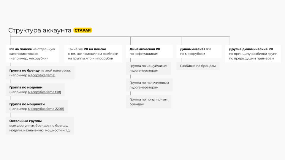 За последние месяцы Яндекс много сделал для автоматизации процессов и развития машинного обучения. Поэтому после анализа старой и неэффективной структуры аккаунта мы решили уйти от её детальной разбивки и тестировать автоматические стратегии, предлагаемые Директом.