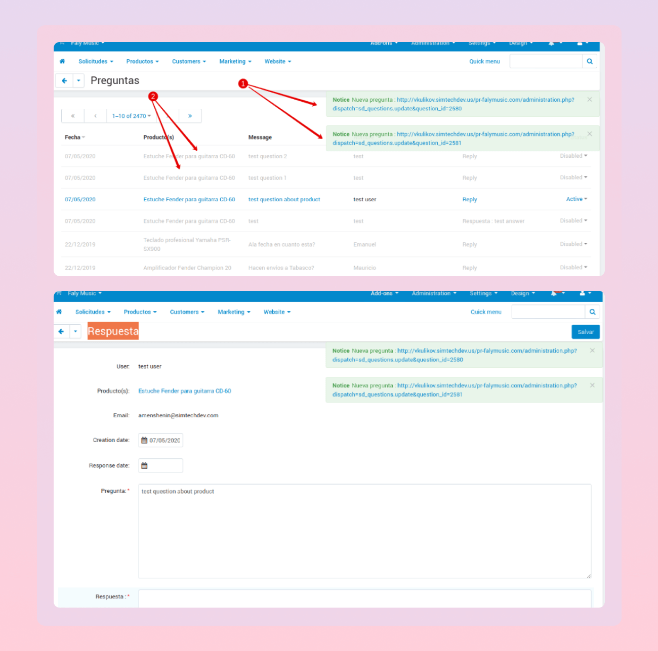Если пользователь задавал вопрос на странице "Просмотр товара", то скрипт сохранял цену и код продукта, чтобы администратору было легче погрузиться в контекст вопроса.
