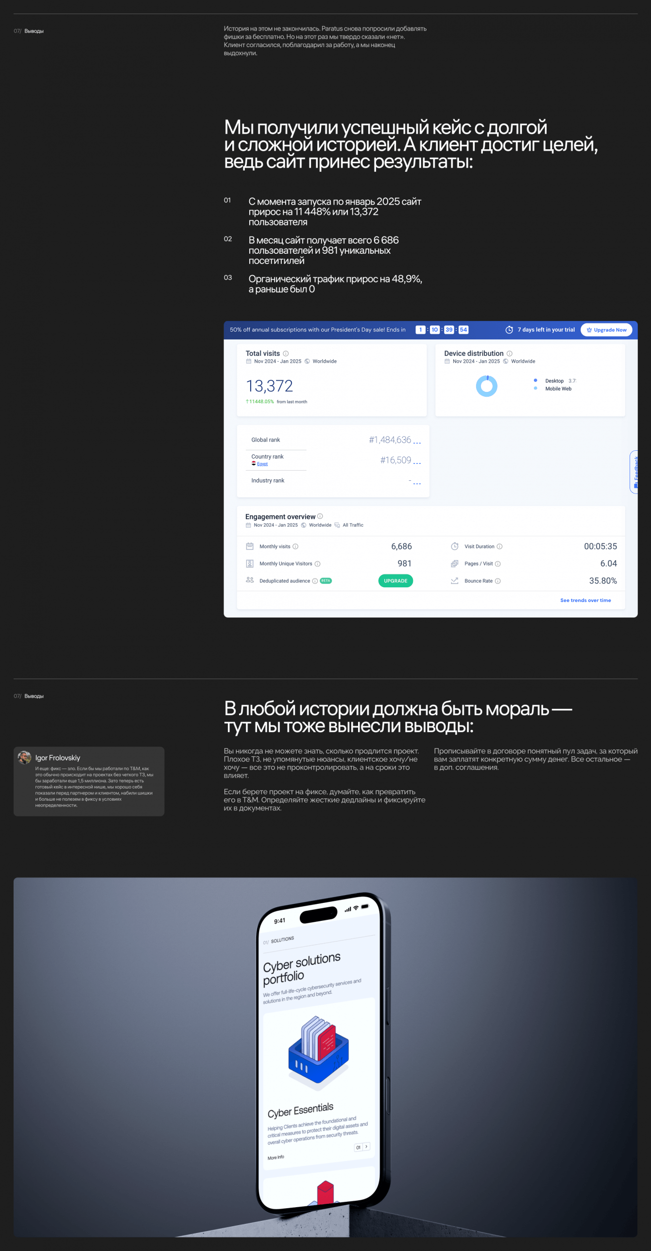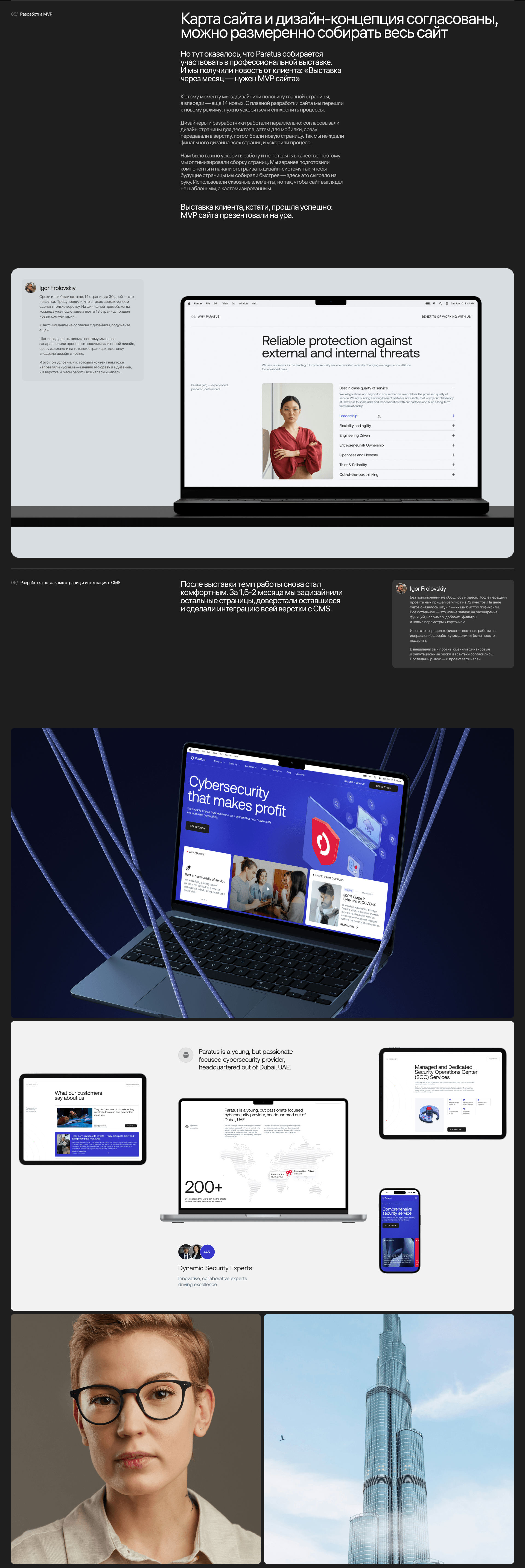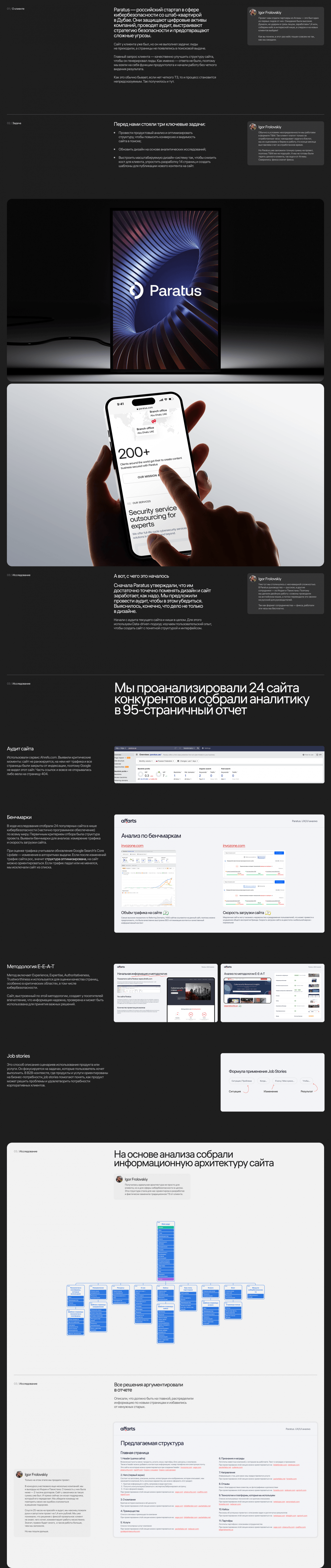 Отзыв Игоря Фроловского о проекте Paratus Paratus — это сложный, многослойный проект, где дизайн должен был не просто «красиво выглядеть», а решать конкретные задачи: выстроить доверие, четко объяснить услуги и помочь пользователю с навигацией в мире кибербезопасности.