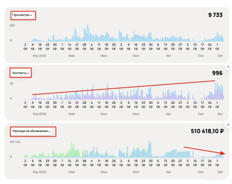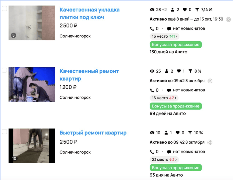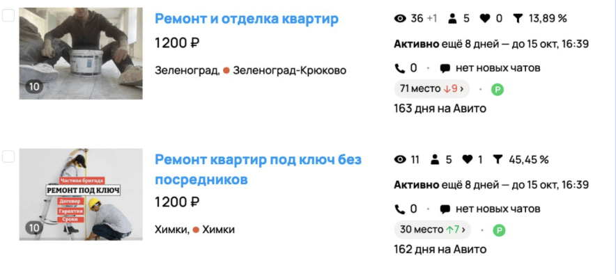 Привет, на связи OVEN AGENCY. Мы официальные партнеры Авито и более 8 лет помогаем бизнесу получать клиентов через площадку. С 2016 года с нами поработали свыше 350 компаний — от товаров до услуг. Мы продвигаем бизнес на Авито так, чтобы он получал от 150 до 2000 заявок в месяц по цене 50–200 рублей. Для нас важно не просто «гнать трафик», а выстраивать предсказуемый поток клиентов, который стабильно окупается. Работаем с клиентами в долгую: фиксируем еженедельные KPI и обеспечиваем результат благодаря строгой системе контроля. Сегодня расскажем о проекте в сфере капитального ремонта квартир. Это свежий кейс, который показывает: даже в нише с высокой конкуренцией и неидеальной обработкой заявок можно получить мощный поток клиентов и прибыль. История клиента В апреле к нам обратился владелец компании по ремонту квартир в Московской области. Основное направление — капитальный ремонт и отделочные работы. Клиент работал в пяти городах Подмосковья и хотел получать стабильный поток обращений, чтобы загрузить бригаду заказами. До сотрудничества с нами у компании рекламы в интернете не было. Авито пробовали вести сами, но системной работы не хватало. Как следствие: 1–2 случайные заявки в неделю, которые не давали нужного эффекта. Ключевая задача клиента: «Нужны стабильные заявки на ремонт в Подмосковье по адекватной цене, чтобы работы хватало на несколько объектов сразу». С чего мы начали работу Первым шагом мы собрали бриф и составили паспорт клиента: направления, целевая аудитория, прогнозы по бюджету и заявкам. Дальше перешли к активным действиям: сегментировали продвижение сразу по пяти городам Московской области, чтобы охватить локальный спрос; создали и оптимизировали объявления под капитальный ремонт квартир и отдельные отделочные работы; Посмотрите какие карточки были ДО И карточки ПОСЛЕ протестировали разные форматы подачи (подробные описания, фотографии, инфографика); работали с платным продвижением в категории «Услуги» для закрепления позиций. Наша стратегия заключалась в том, чтобы не ограничиваться одним «общим» объявлением, а под каждую потребность клиента (например, капитальный ремонт под ключ, укладка плитки, отделка ванной) создавать отдельное предложение. Это увеличивало охват и давало возможность собирать заявки по разным сегментам.