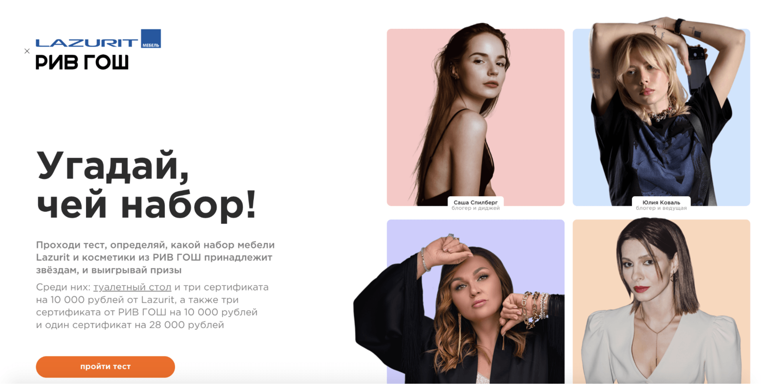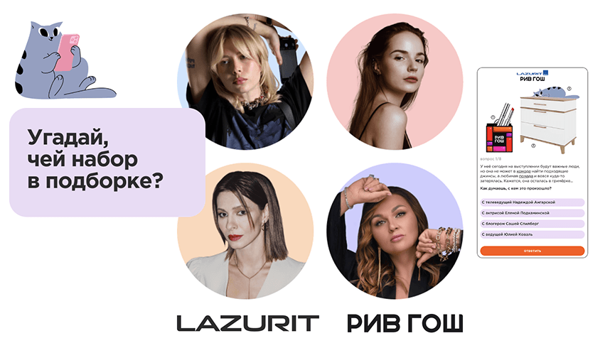 Мы предложили объединить Lazurit с брендом РИВ ГОШ в коллаборации, которая связала интерьер и бьюти-сферу. Мы разработали интерактивный проект с четырьмя героинями — инфлюенсерами из разных сфер. Пользователям предлагалось угадать, чей набор зашифрован в подборке. Для кампании мы подобрали инфлюенсеров, помогли в организации фотосъемки, создали лендинг с текстами и визуалом, а также поддержали проект в соцсетях и у блогеров.