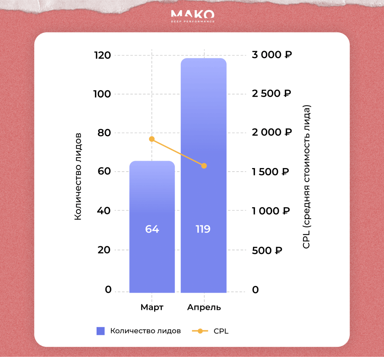 Уже в первый месяц получили 68 заявок — на 50% больше по сравнению с месяцем до нашего сотрудничества. Причем, это были заявки по маржинальным товарам, без «мусора» и второстепенных направлений. CPL — 2200 ₽ (в 3–4 раза ниже, чем до перезапуска).