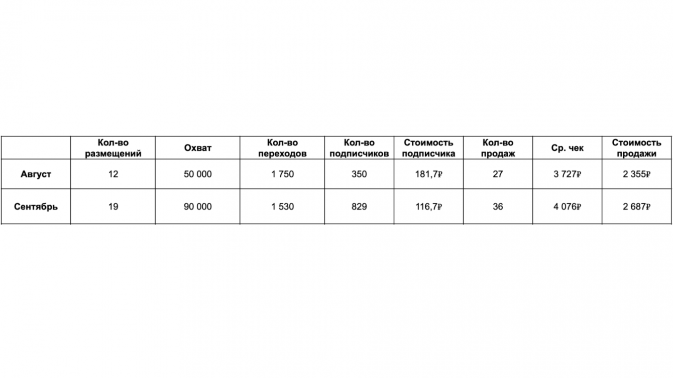- Привели 829 новых подписчиков по 116,7 руб.;