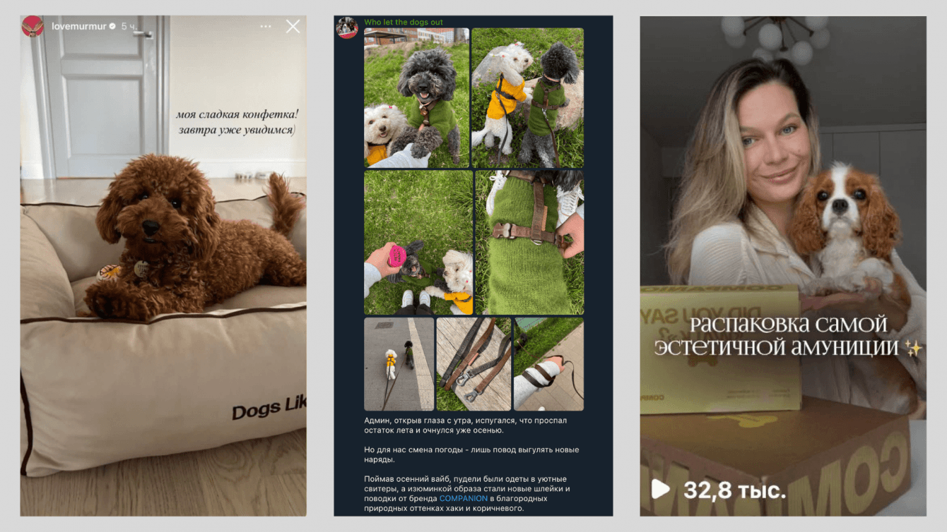 1. Блогеры-владельцы собак: в таких блогах делали акцент на красивую распаковку, примерку и взаимодействие хозяина с питомцем, их общие эмоции от новых аксессуаров.