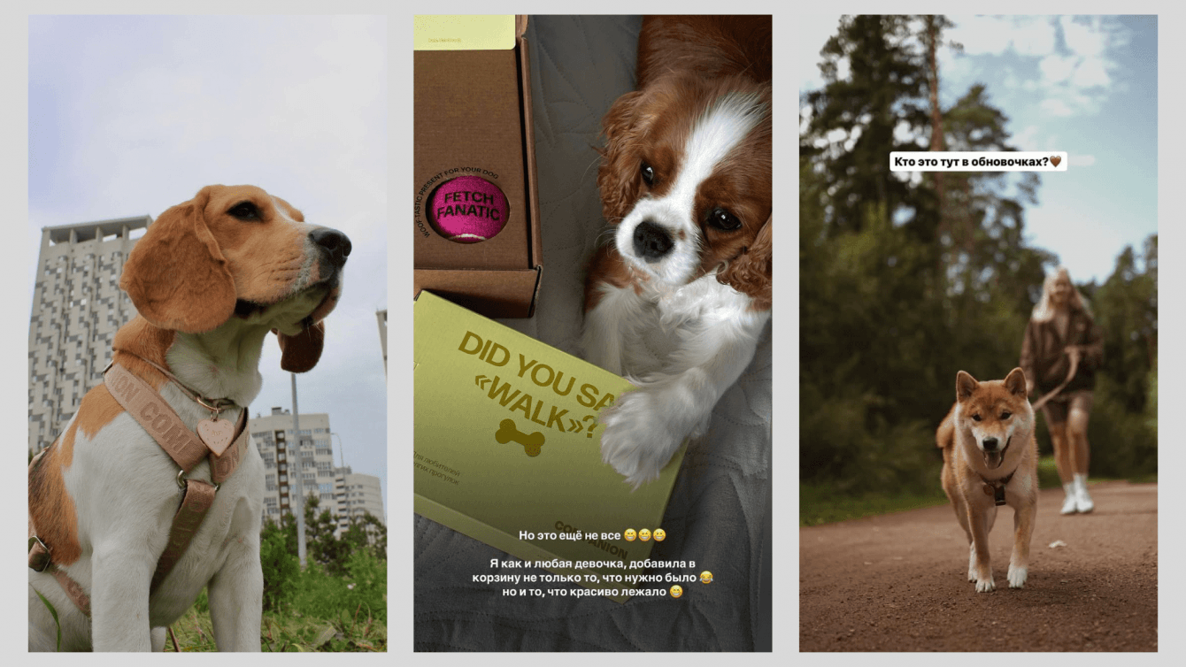 - stories — возможность показать эстетичную распаковку амуниции, примерку на собаке и, самое главное, оставить кликабельную ссылку на сайт, отметку бренда и промокод;