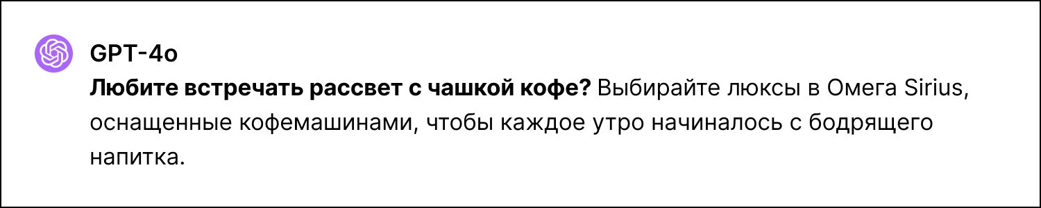 Когда мы начали работу над первой главой, пришло время материала, который имел хорошую структуру описания отелей. Однако мы не показывали его целиком, а только копипастили нужные фрагменты. Основной идеей первой главы должны были стать факторы выбора отелей. Мы привели в пример часть из третьего текста про отдых с детьми, когда родителям важно наличие в номере кухни: «Едете на море с семьей? Обратите внимание на номера с кухней в Прибрежном квартале, где можно легко готовить перекусы и обеды для ваших малышей». ИИ должен был придумать ряд жизненных ситуаций, на которые отвечало бы соответствующее оснащение номеров в разных отелях сети. Он хорошо с этим справился. Например, для люксов с кофемашинами он предложил такой вариант: