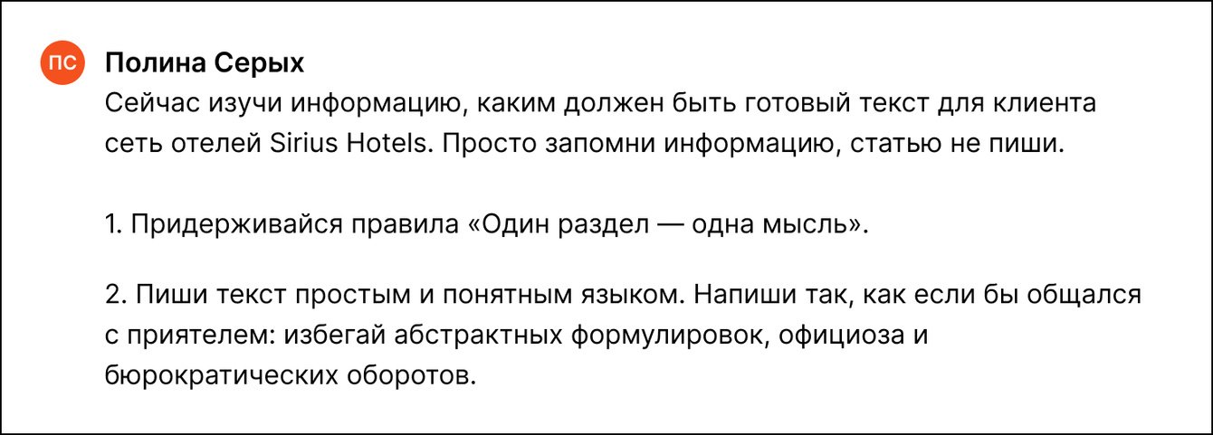 «Представьте, что вы общаетесь со стажером, которому нужно терпеливо объяснять задачу и направлять его во время работы, — делится опытом Полина Серых, редактор агентства i-Media. — Именно этот подход мы использовали при работе с ChatGPT. Это потребовало времени и вовлеченности, но в итоге материал был создан быстрее и по качеству не уступал "человеческому"».