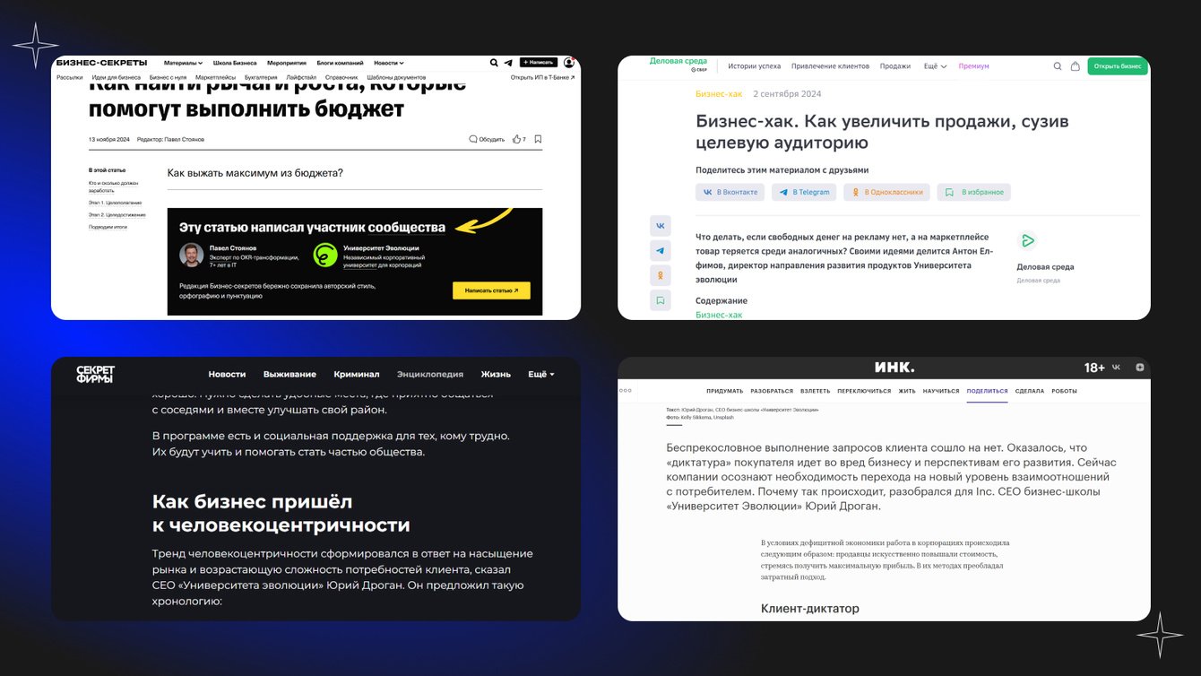 — С июня по ноябрь вышло 9 статей и 3 комментария в профильных и деловых медиа — NBJ, Inc., «Бизнес-Секретах» и других.