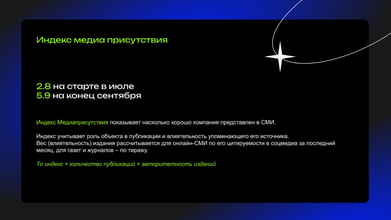 — Медиаприсутствие выросло с нуля до 5,9 баллов (без учета отложенных публикаций), охват — с 97 тысяч до почти 7 миллионов человек.