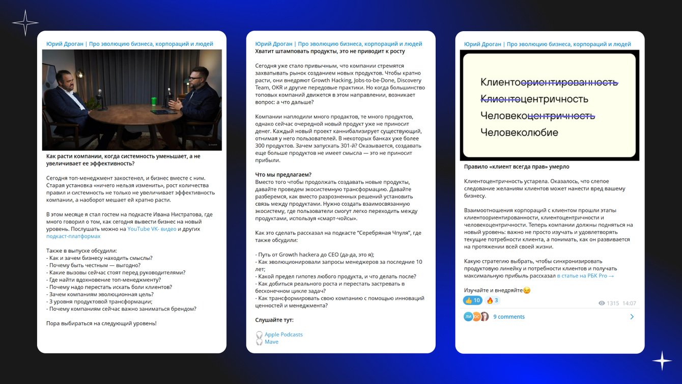 — Вели РБК Компаний и Telegram-каналы: собирали выжимки из публикаций, превращали их в короткие форматы — от деловых дайджестов до постов с зацепкой, чтобы охватить разные сегменты аудитории.