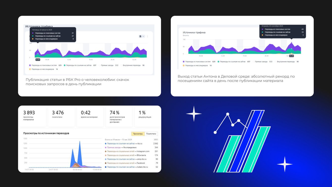 Поэтому сначала работали с отраслевыми и деловыми медиа — чтобы повысить узнаваемость, закрепить экспертизу и сформировать голос команды. Параллельно выстраивали инфраструктуру: формат подачи, тональность и регулярность публикаций.