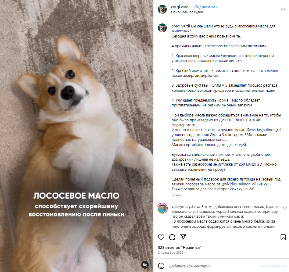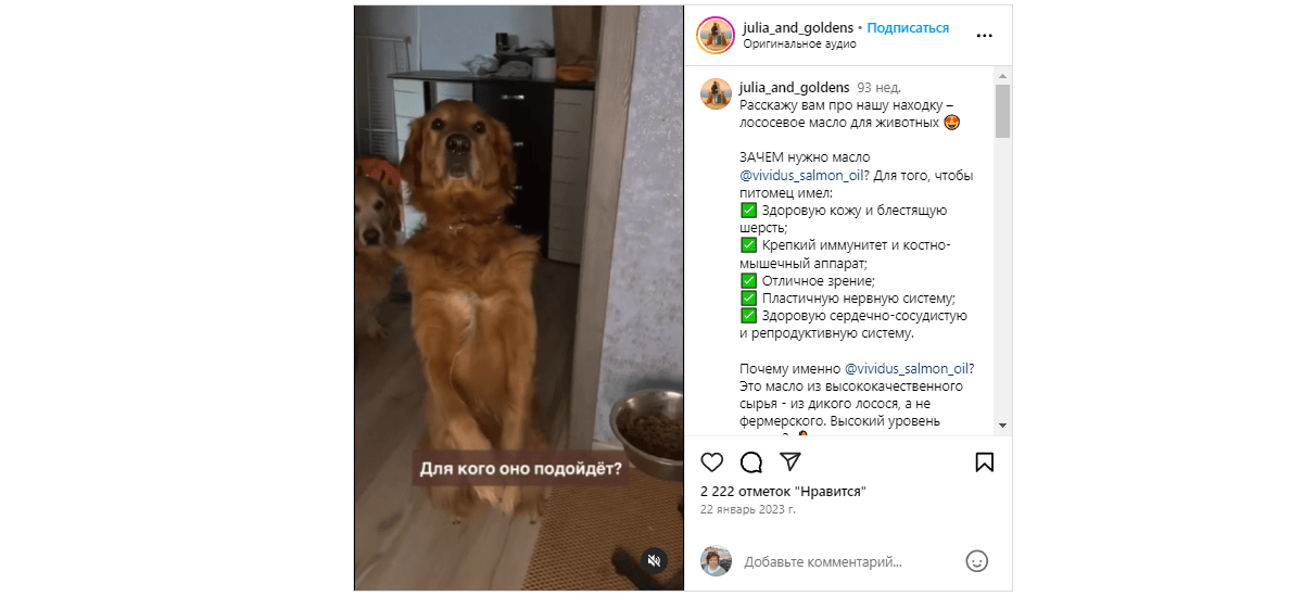 Блог полностью посвящен питомцам. Реклама была подготовлена нативно в формате Reels.