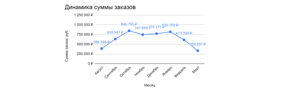 В среднем мы ежемесячно получали заказов на сумму 701 801 руб.