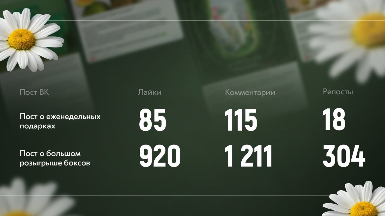 Розыгрыши — один из самых эффективных инструментов, потому что подарки любят все. Каждую неделю мы дарили косметику бренда и раздавали скидки самым активным участникам в качестве поощрения. Также запустили большой розыгрыш боксов с косметикой — вовлеченность выросла еще больше.