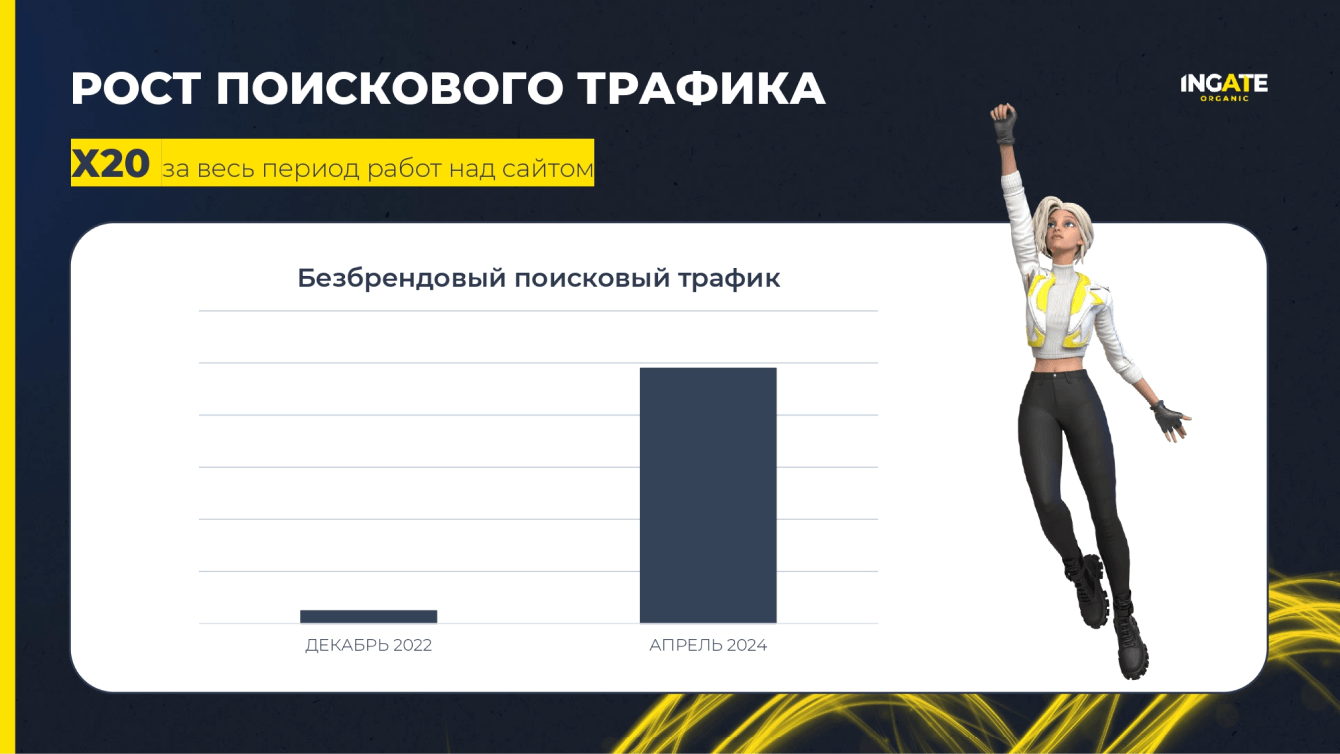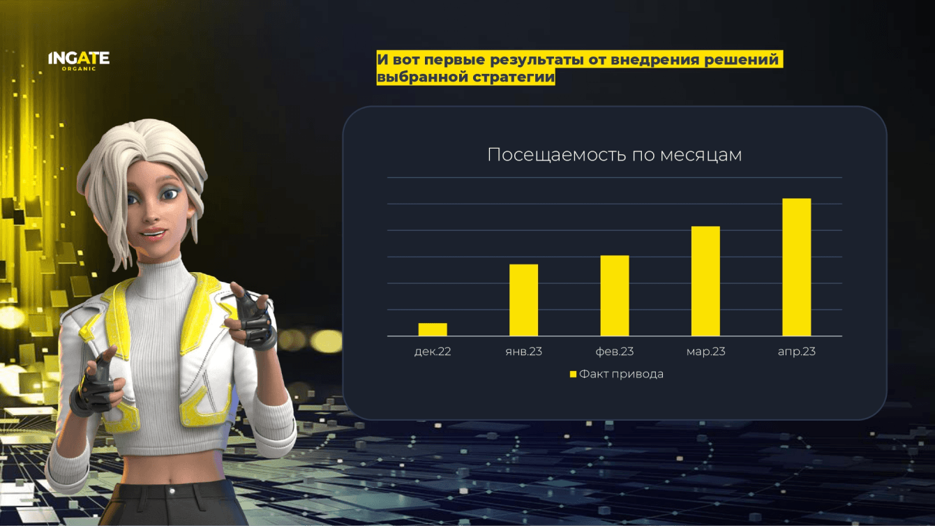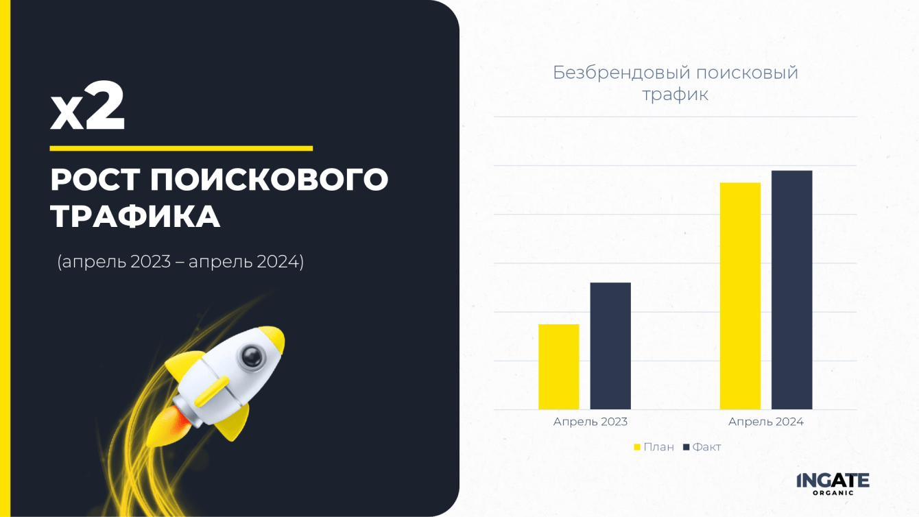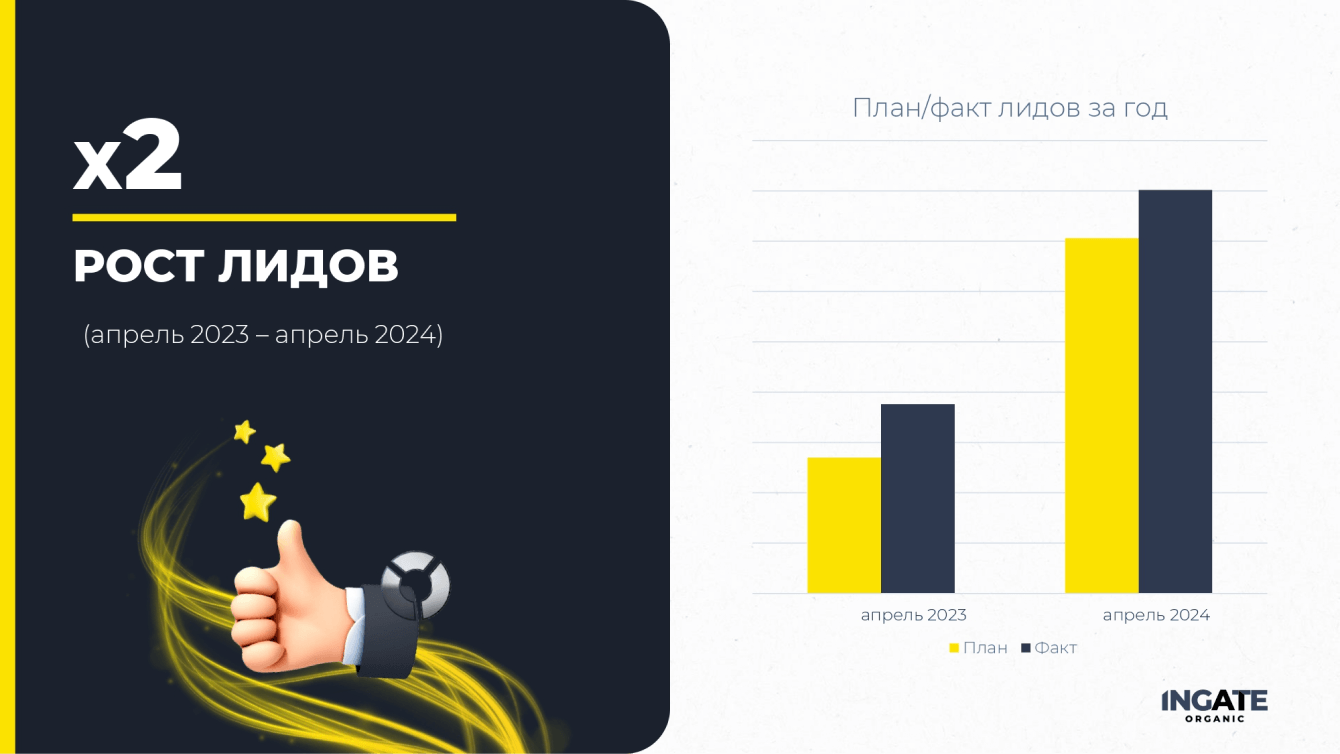 От месяца к месяцу коллеги из Ingate Organic практически всегда выполняют нашу цель по 2-кратному приросту трафика. По росту лидов есть успехи, но еще много работы в этом направлении.