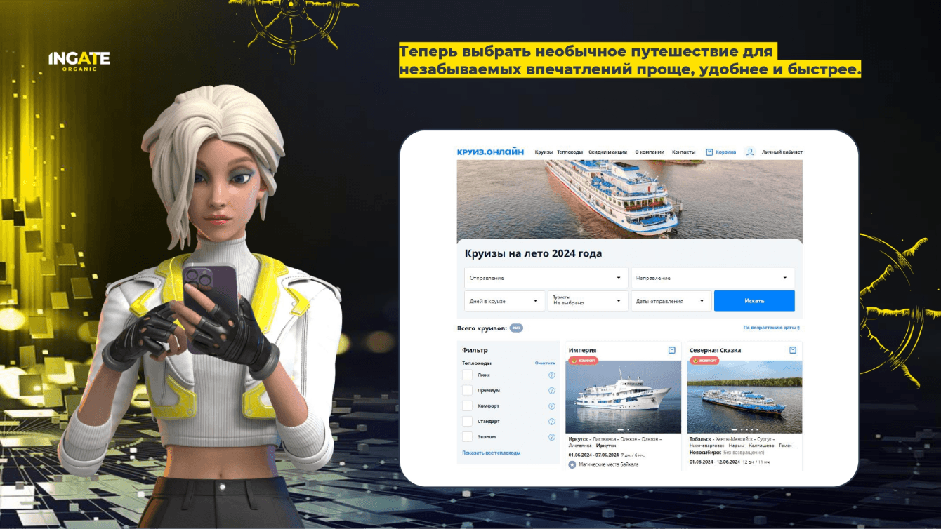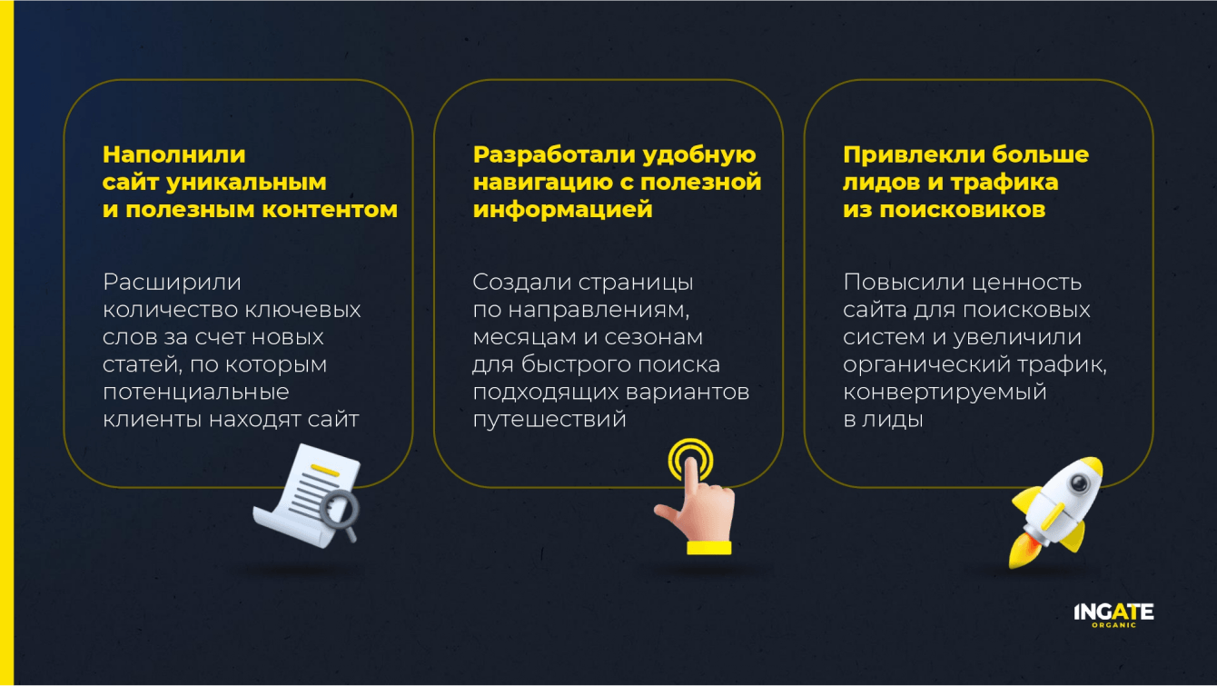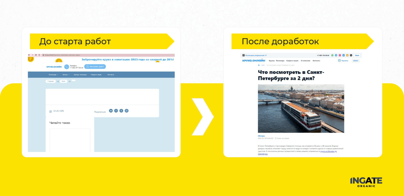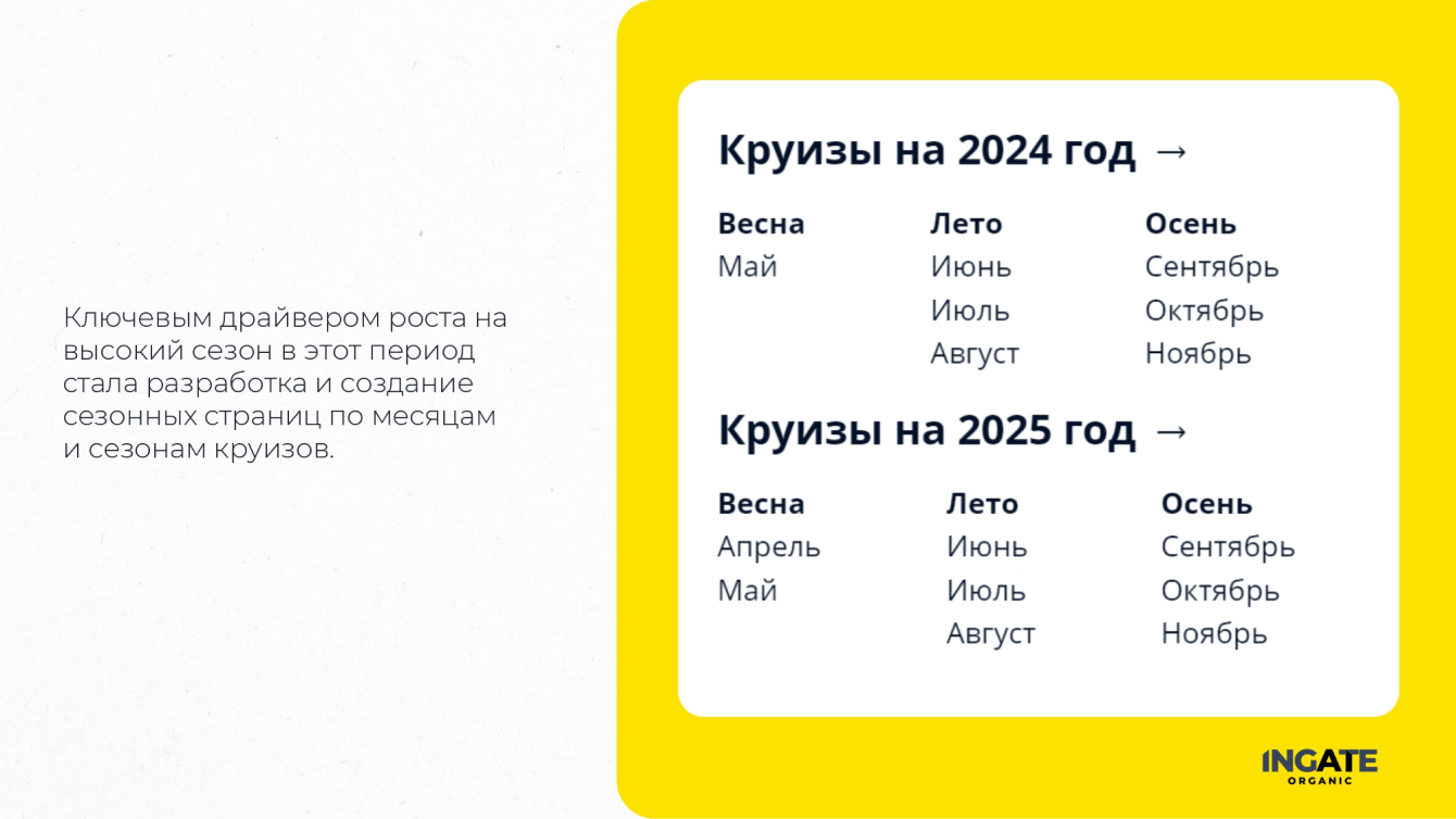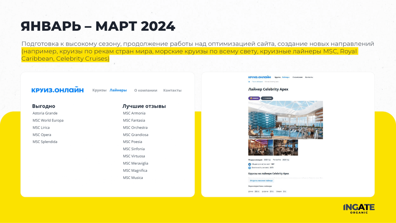 "Мы пришли с запросом получить двухкратный прирост целевого органическоготрафика и лидов. Также поставили задачу перед коллегами из Ingate Organic снизить нагрузку на отдел продаж и стимулировать пользователей оформлять круизы на сайтебез обращения к менеджеру", - комментирует Евгений Аникин, SEO-маркетолог Круиз.онлайн, координатор работ с Ingate Organic.