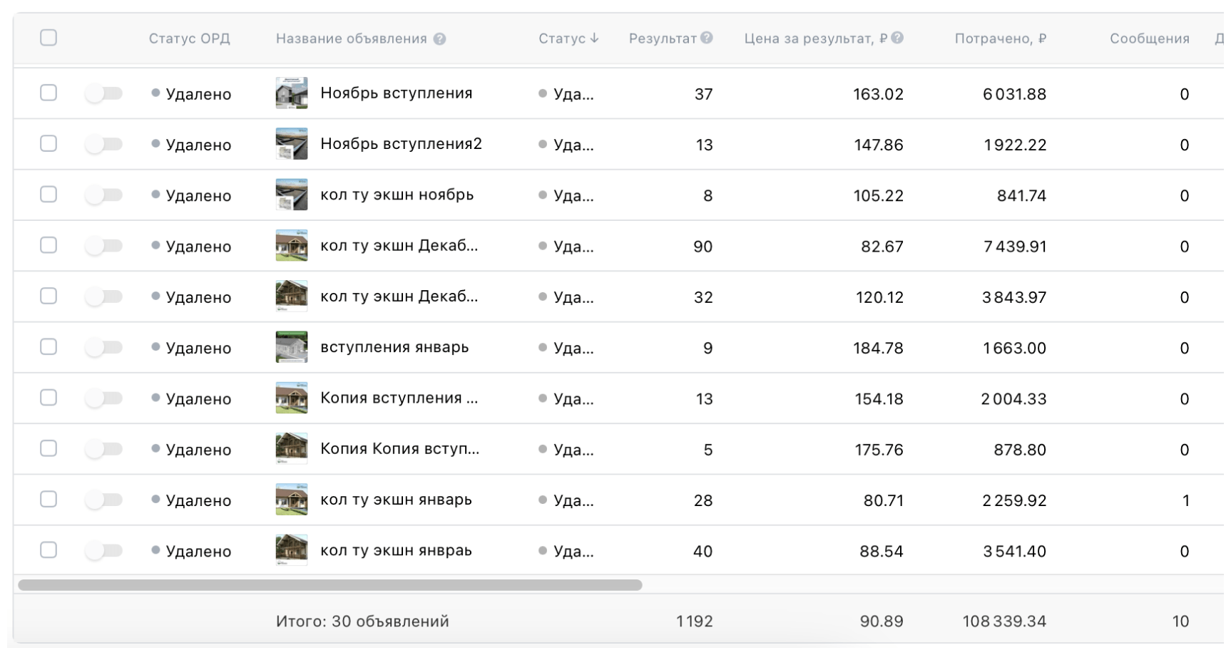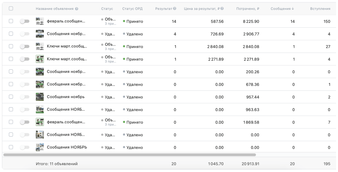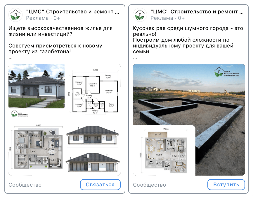 У клиента много фотографий готовых объектов и рендеров из новых проектов. Поэтому для креативов использовали как реальные фотографии домов, так и рендеры, планировки и схемы. Это помогло закрыть часть возражений целевой аудитории.