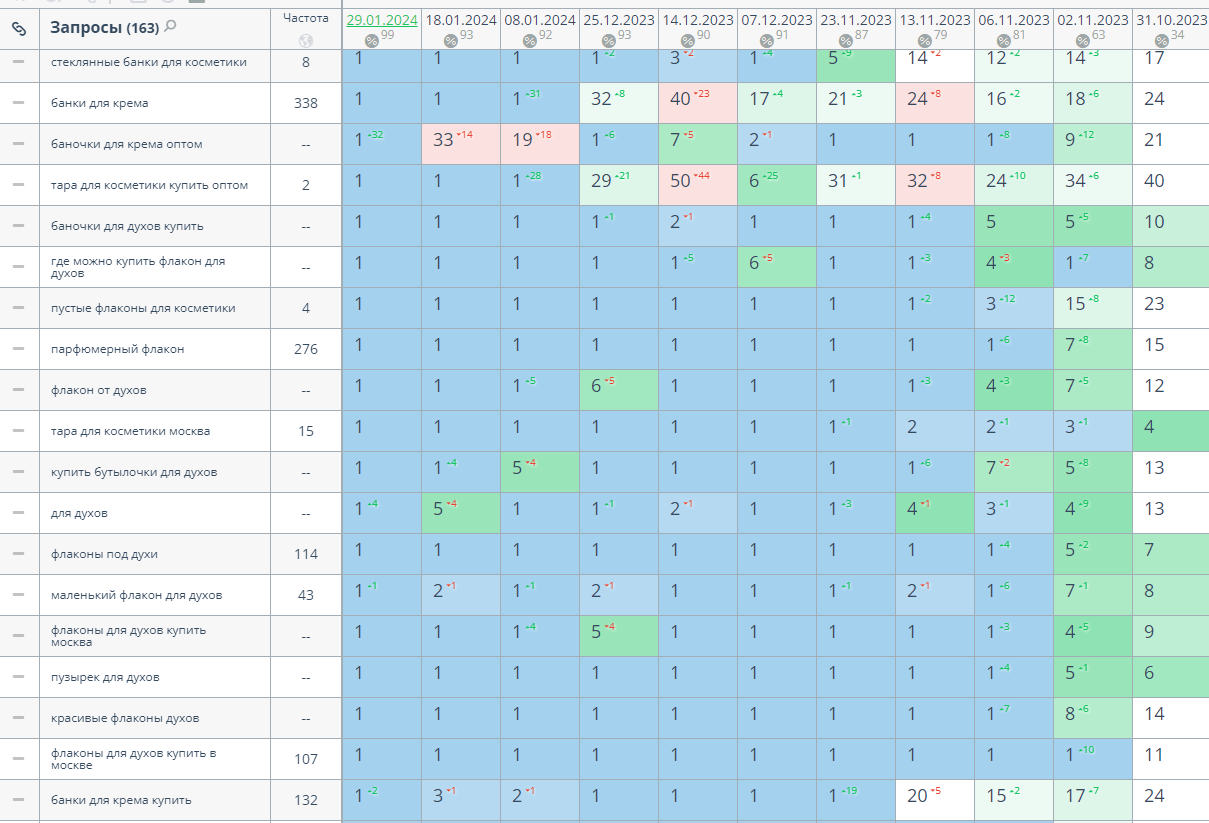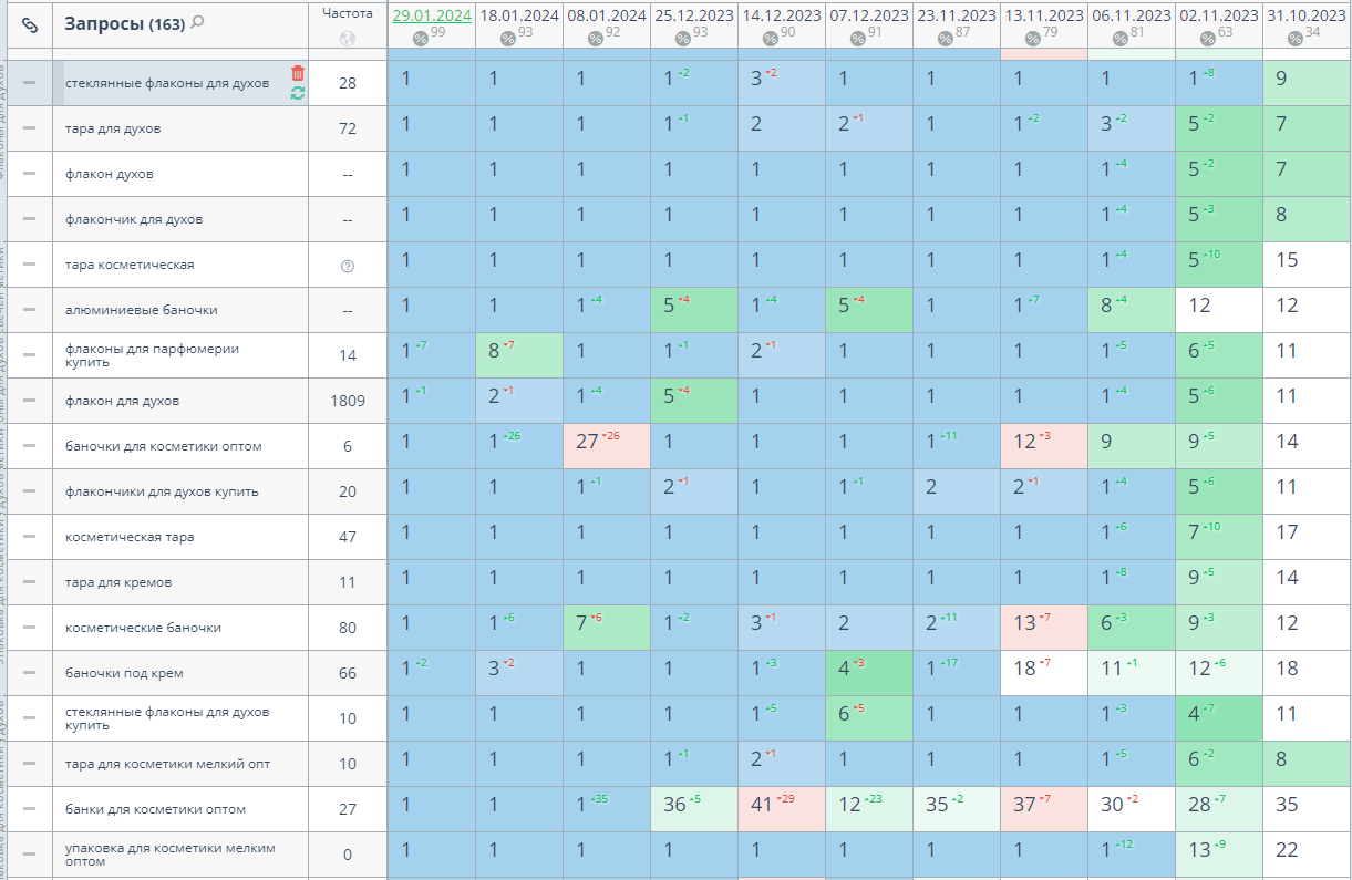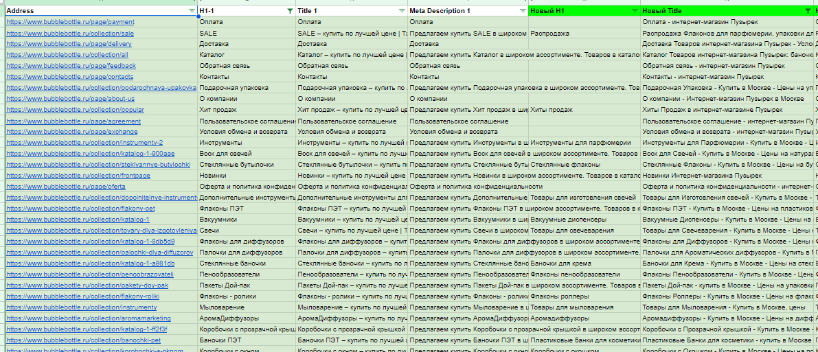 Затем параллельно велся сбор семантического ядра по всей тематике сайта при помощи специализированных сервисов. Были собраны как ключевые фразы общей тематики, например "флаконы для парфюмерии", так и более конкретные нишевые запросы вроде "купить флаконы для парфюмерии оптом". Все ключи были распределены на кластеры по принципам смысловой близости и товарной принадлежности.