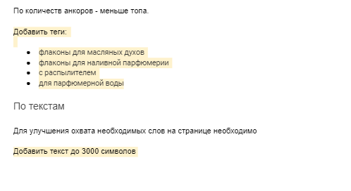 Особое внимание уделялось категориям среднего уровня, которые содержали большие кластеры поисковых запросов. Например, под оптимизацию попали такие разделы как "Флаконы для духов", "Парфюмерные аксессуары", "Декоративные свечи и аромамасла" и пр.