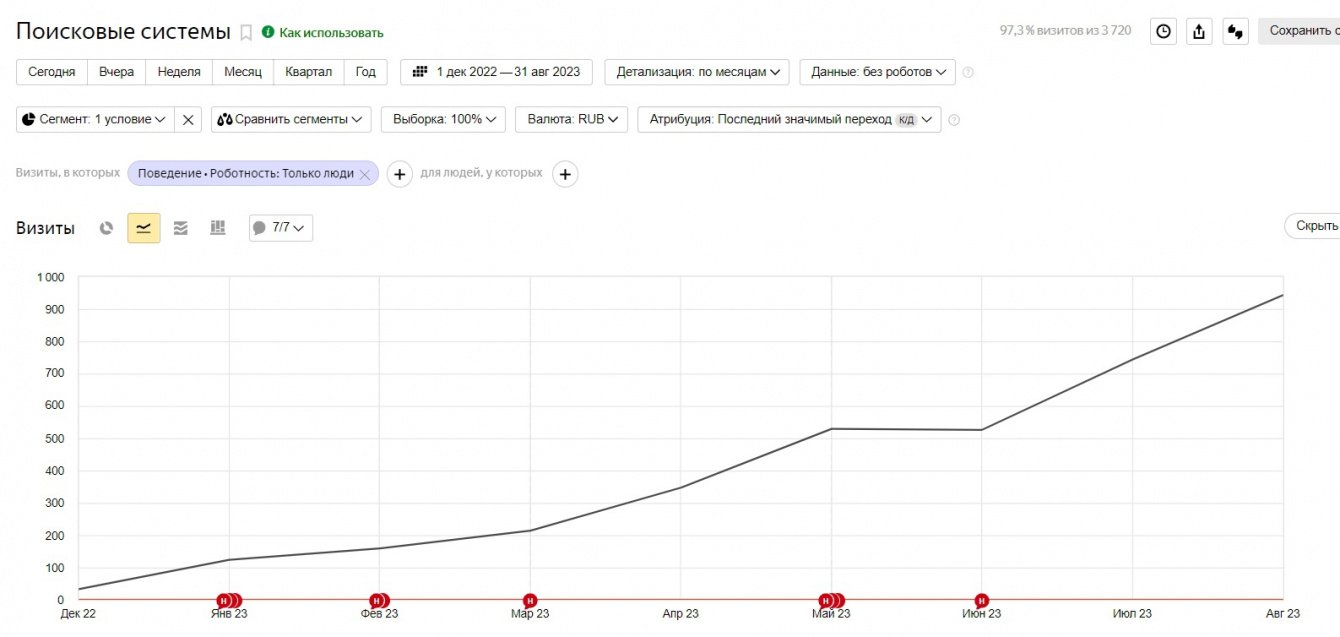 По данным сервиса веб-аналитики Яндекс.Метрика, уже через 3-4 месяца после старта работ был зафиксирован существенный рост посещаемости сайта "Флаконы для духов". Если на стартовом этапе среднемесячный трафик не превышал 40 уникальных посетителей, то к контрольной точке этот показатель достиг впечатляющей отметки в 950 визитов. В процентном соотношении прирост трафика составил колоссальные 2275%!