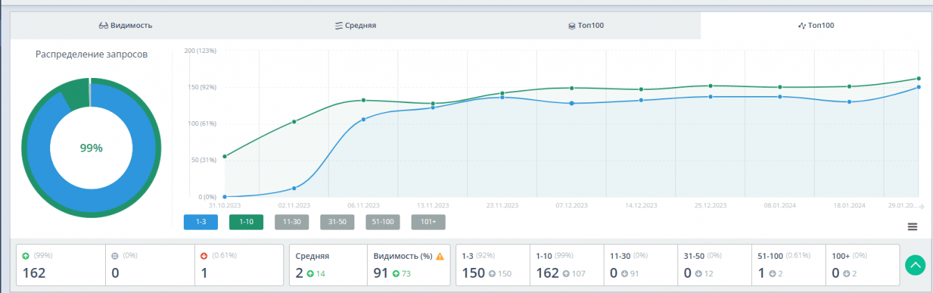 Столь впечатляющие количественные результаты полностью оправдали ожидания и превзошли поставленные цели. Проект вышел на лидирующие позиции по большинству высокочастотных коммерческих запросов, что обеспечило стабильный рост целевого трафика потенциальных клиентов.