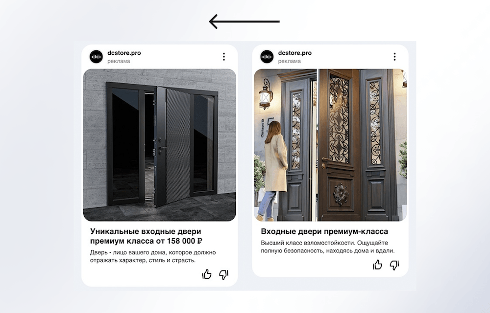 — Ретаргетинг во ВКонтакте. Цикл сделки в данном продукте может быть высоким, поэтому наша задача максимально прогреть весь путь клиента. Человек попал на наш сайт и после начинает везде видеть рекламу, в том числе в соц. сетях. Но во ВКонтакте мы не делаем прямую продажу, мы аккуратно показываем статьи (где рассказываем о преимуществах наших дверей), а также показываем примеры реализованных работ.