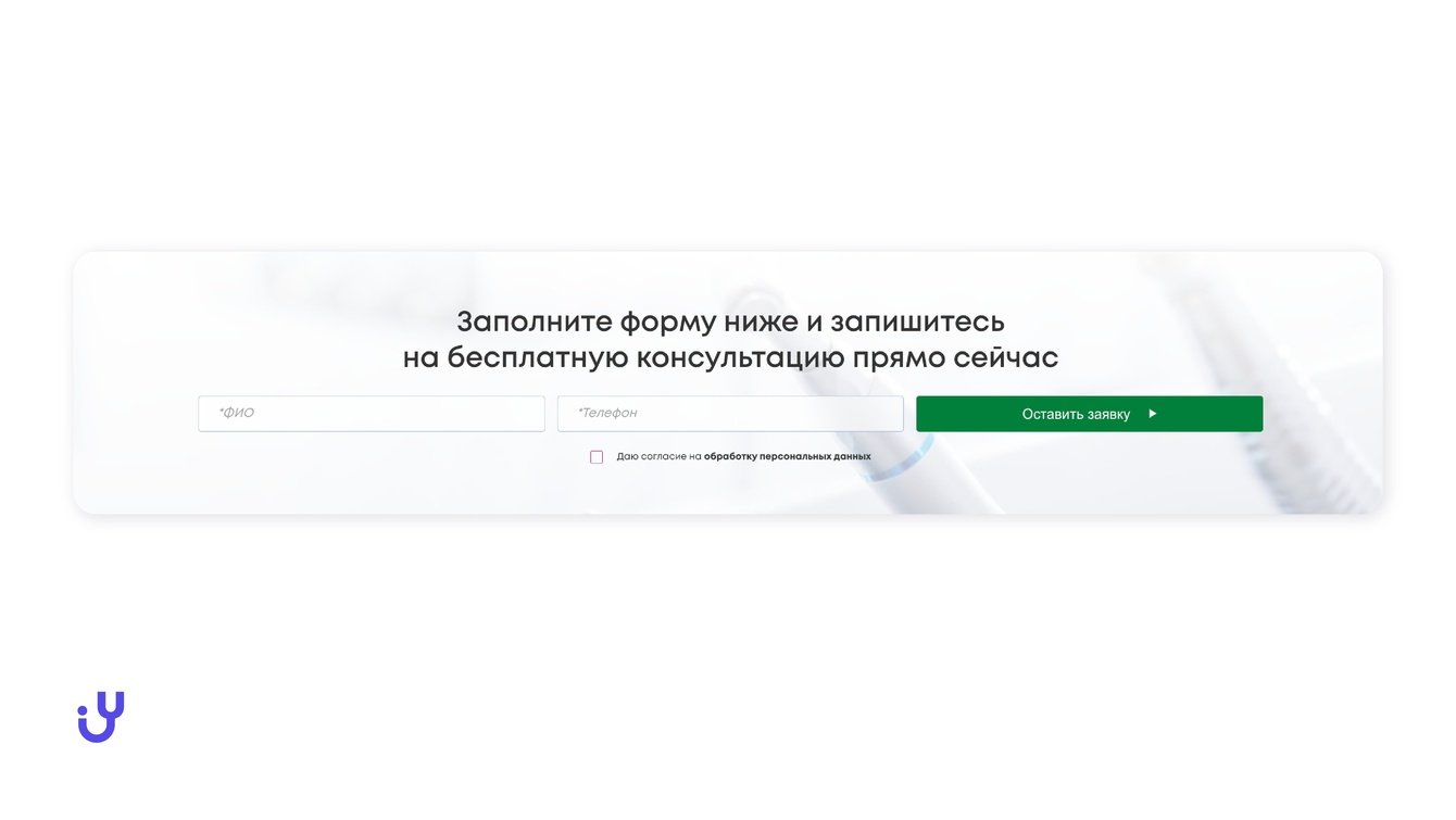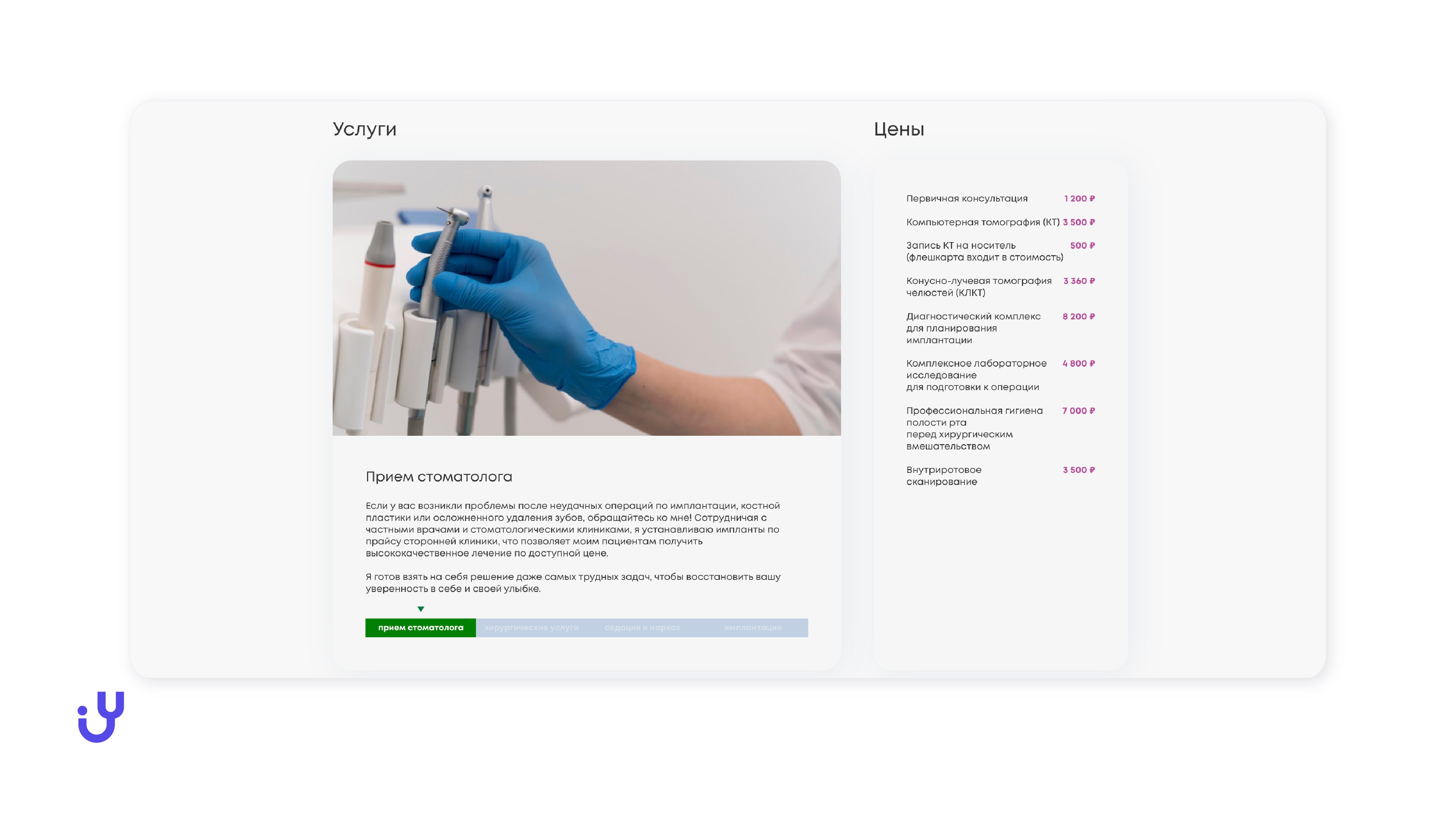 Мы добавили на лендинг наглядное портфолио врача в виде фотографий пациентов до и после проведения процедур. Реальные результаты работы имплантолога лучше всего мотивируют пациентов к записи на прием и снимают сомнения в профессионализме врача.