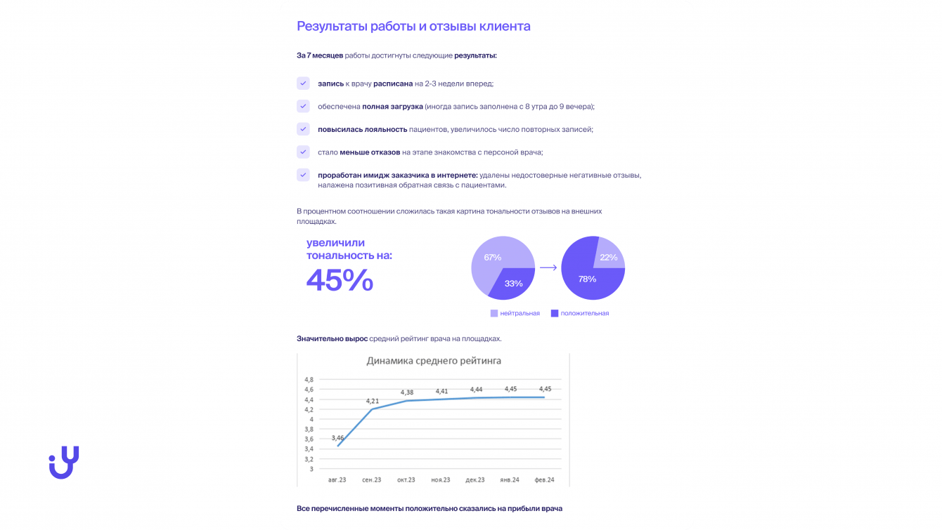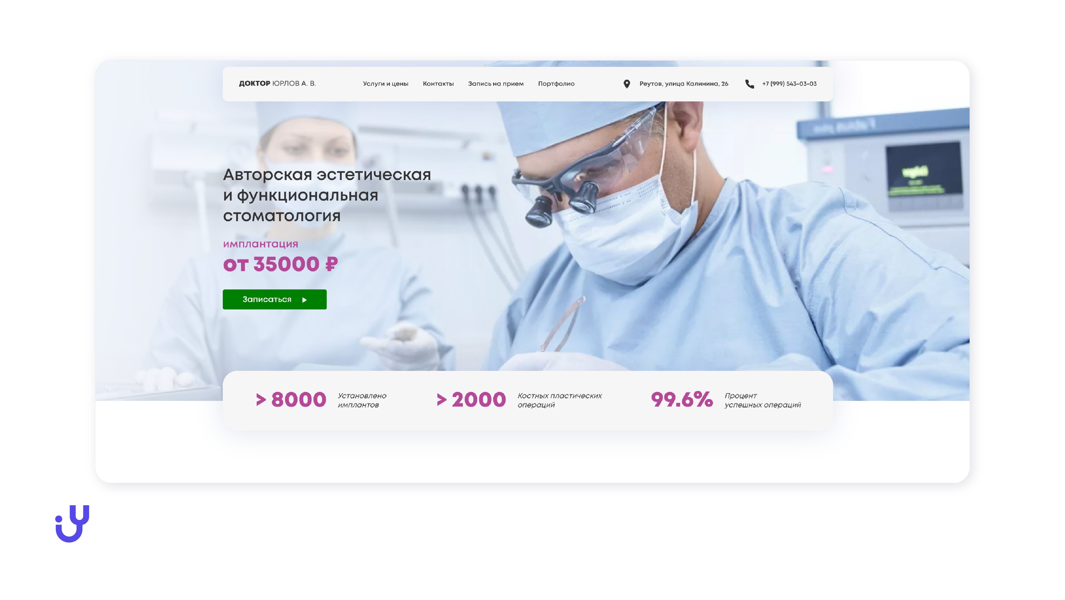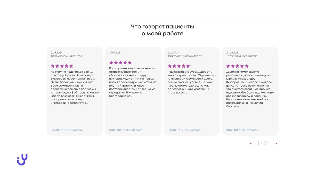 Лендинг отражает профессиональные качества врача и мотивирует к записи на прием. Кроме того, лендинг — мощный инструмент в управлении персональной репутацией. На нем собираются отзывы пациентов с разных площадок, что формирует общий положительный образ доктора.