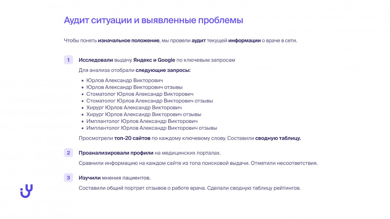 Чтобы понять изначальное положение, мы провели аудит текущей информации о враче в сети. По его итогам решили достигать поставленных целей с помощью двух инструментов: