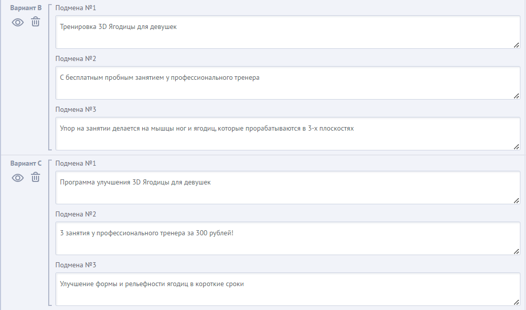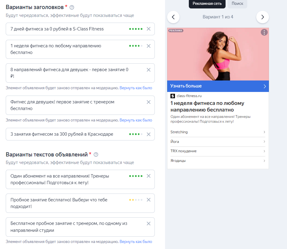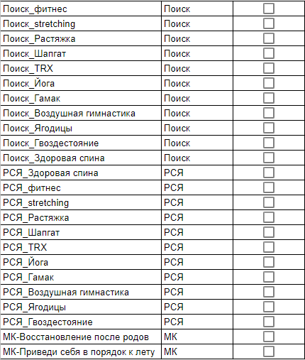 Первым делом — провели бриф с клиентом, выяснили детали работы фитнес-студии и возможности по узконаправленным тренировкам. Чтобы повысить конверсию на сайте, решили использовать гиперсегментацию от Яглы. Затем выписали все направления фитнеса и собрали кампании: