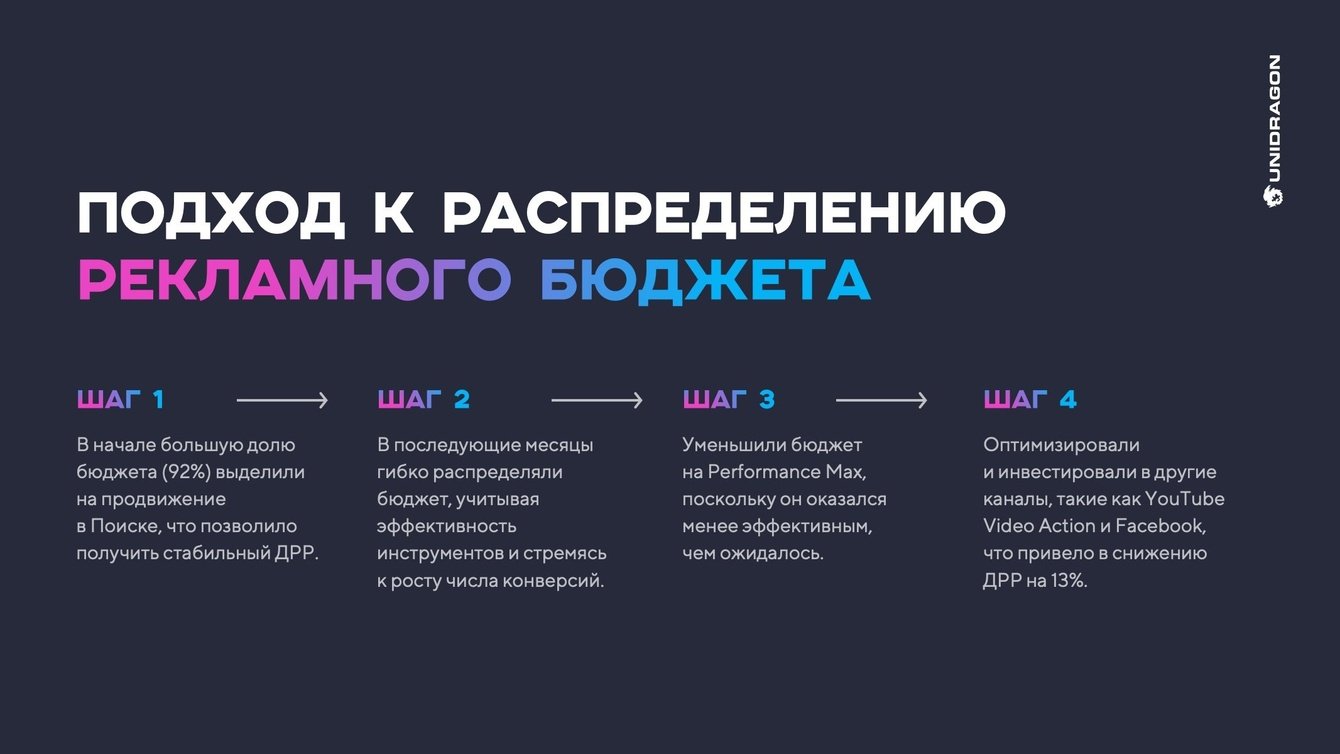 - Поскольку Performance Max оказался менее эффективным, чем ожидалось, уменьшили бюджет на него.