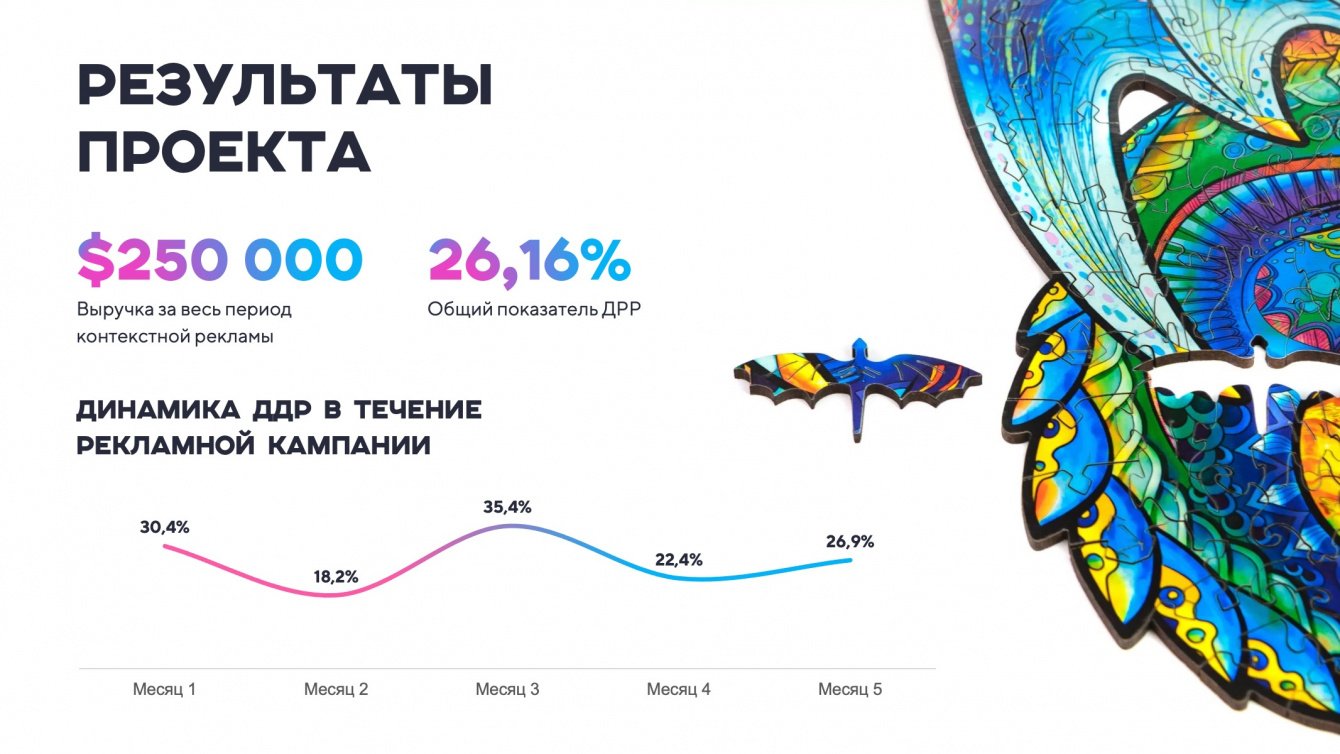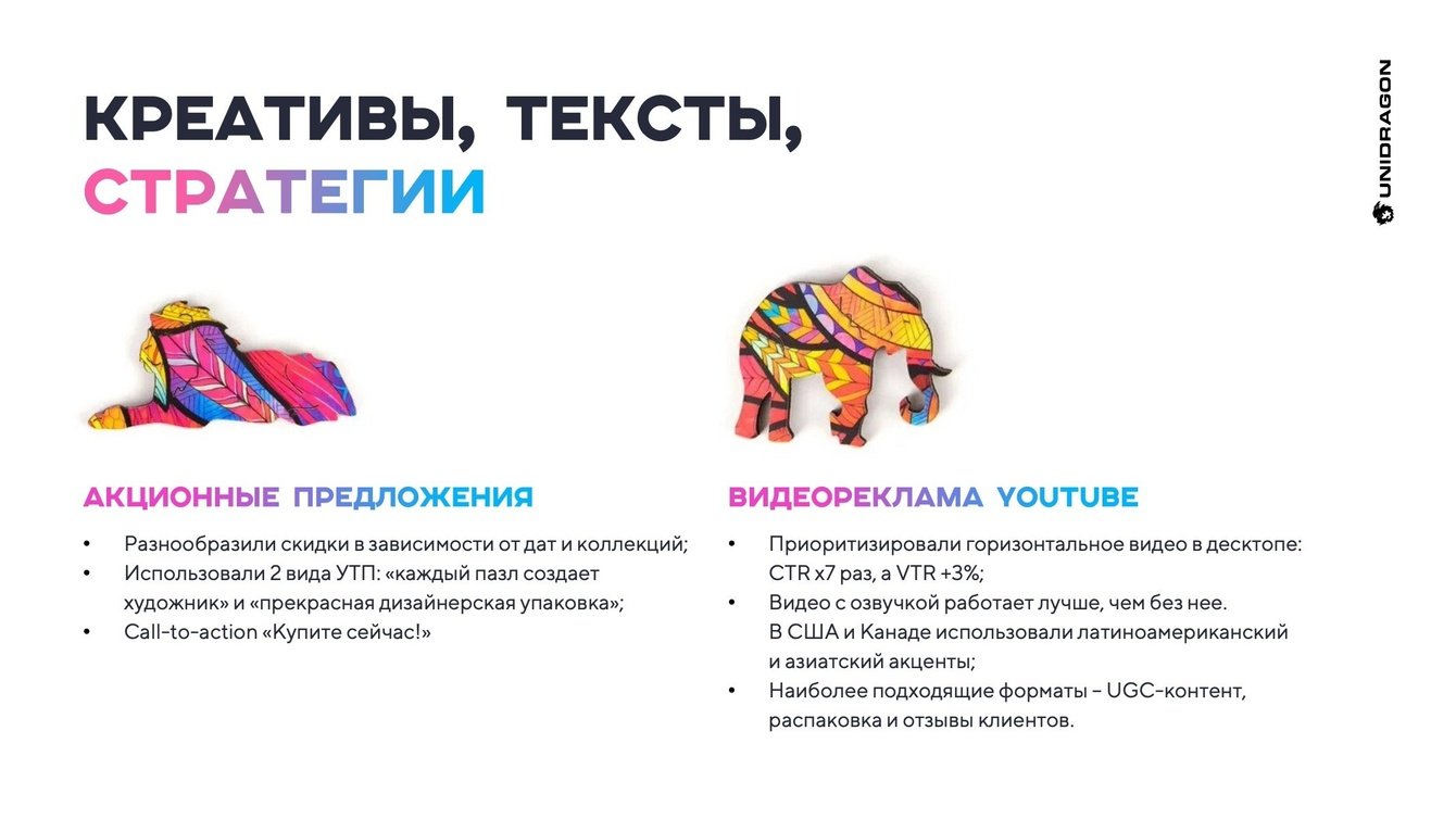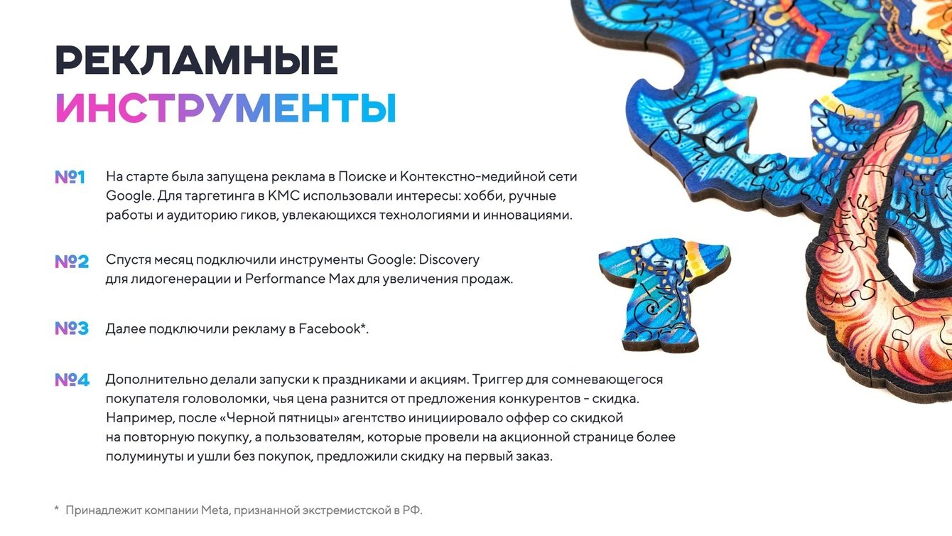 - Использовали два вида УТП: «каждый пазл создает художник» и «прекрасная дизайнерская упаковка».